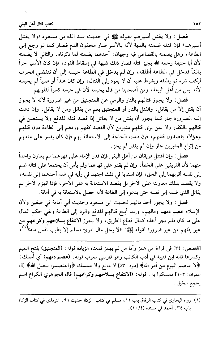 فصل: ولا يجوز أخذ مالهم لحديث ابن مسعود وحديث أبي أمامة في صفين ولأن الإسلام عصم دمهم ومالهم وإنما أبيح قتالهم للدفع والرد إلى الطاعة وبقي حكم المال على ما كان فلم يجز أخذه كمال قطاع الطريق ولا يجوز الانتفاع بسلاحهم وكراعهم من غير إذنهم من غير ضرورة لقوله صلى الله عليه وسلم: "لا يحل مال امرئ مسلم إلا بطيب نفس منه" 1.
