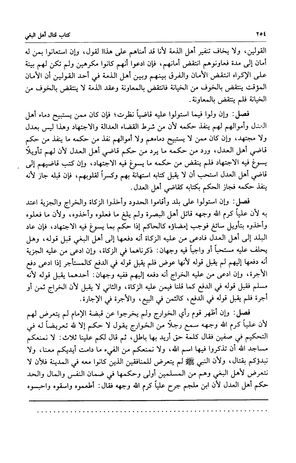 فصل: وإن أظهر قوم رأي الخوارج ولم يخرجوا عن قبضة الإمام لم يتعرض لهم لأن علياً كرم الله وجهه سمع رجلاً من الخوارج يقول لا حكم إلا لله تعريضاً له في التحكيم في صفين فقال كلمة حق أريد بها باطل ثم قال لكم علينا ثلاث: لا نمنعكم مساجد الله أن تذكروا فيها اسم الله ولا نمنعكم من الفيء ما دامت أيديكم معنا ولا نبدؤكم بقتال ولأن النبي صلى الله عليه وسلم لم يتعرض للمنافقين الذين كانوا معه في المدينة فلأن لا نتعرض لأهل البغي وهم من المسلمين أولى وحكمها في ضمان النفس والمال والحد حكم أهل العدل لأن ابن ملجم جرح عليا كرم الله وجهه فقال: أطعموه واسقوه واحبسوه