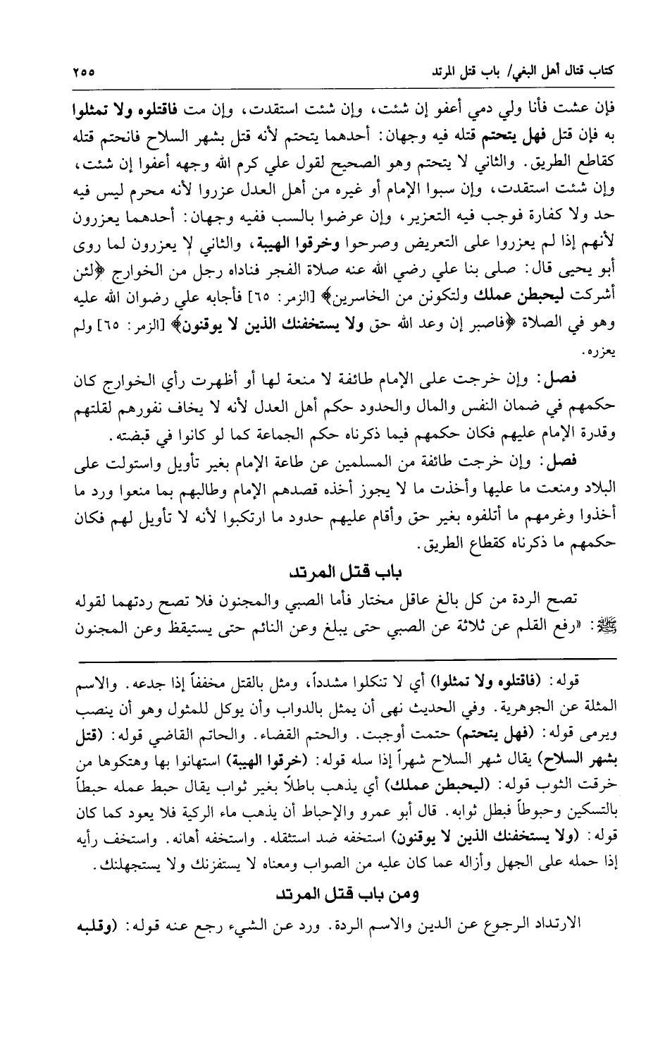 فإن عشت فأنا ولي دمي أعفو إن شئت وإن شئت استقدت وإن مت فاقتلوه ولا تمثلوا به فإن قتل فهل يتحتم قتله فيه وجهان: أحدهما: يتحتم لأنه قتل بشهر السلاح فانحتم قتله كقاطع الطريق والثاني: لا يتحتم وهو الصحيح لقول علي كرم الله وجهه أعفوا إن شئت وإن شئت استقدت وإن سبوا الإمام أو غيره من أهل العدل عزروا لأنه محرم ليس فيه حد ولا كفارة فوجب فيه التعزيز وإن عرضوا بالسب ففيه وجهان: أحدهما: يعزرون لأنهم إذا لم يعزروا على التعريض وصرحوا وخرقوا الهيبة والثاني: لا يعزرون لما روى أبو يحيى قال: صلى بنا علي رضي الله عنه صلاة الفجر فناداه رجل من الخوارج {لَئِنْ أَشْرَكْتَ لَيَحْبَطَنَّ عَمَلُكَ وَلَتَكُونَنَّ مِنَ الْخَاسِرِينَ} [الزمر: 65] فأجابه علي رضوان الله عليه وهو في الصلاة {فَاصْبِرْ إِنَّ وَعْدَ الله حَقٌّ وَلا يَسْتَخِفَّنَّكَ الَّذِينَ لا يُوقِنُونَ} [الزمر: 65] ولم يعزره.