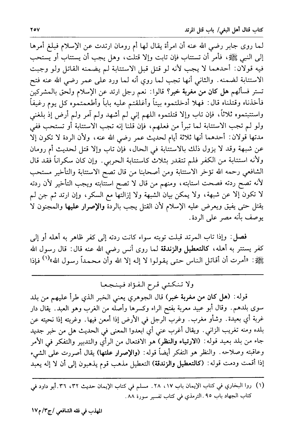 لما روى جابر رضي الله عنه أن امرأة يقال لهل أم رومان ارتدت عن الإسلام فبلغ أمرها إلى النبي صلى الله عليه وسلم فأمر أن تستتاب فإن تابت وإلا قتلت وهل يجب أن يستتاب أو يستحب فبه قولان أحدهما: لا يجب لأنه لو قتل قبل الاستتابة لم يضمنه القاتل ولو وجبت الاستتابة لضمنه والثاني: أنها تجب لما روي أنه لمل ورد على عمر رضي الله عنه فتح تستر فسألهم هل كان من مغربة خبر؟ قالوا: نعم رجل ارتد عن الإسلام ولحق بالمشركين فأخذناه وقتلناه قال: فهلا أدخلتموه بيتا وأغلقتم عليه بابا وأطعمتموه كل يوم رغيفا واستتبتموه ثلاثا فإن تاب وإلا قتلتموه اللهم إني لم أشهد ولم آمر ولم أرض إذ بلغني ولو لم تجب الاستتابة لما تبرأ من فعلهم فإن قلنا أنه تجب الاستتابة أو تستحب ففي مدتها وجهان: أحدهما: أنها ثلاثة أيام لحديث عمر رضي الله عنه ولأن الردة لا تكون إلا عن شبهة وقد لا يزول ذلك بالاستتابة في الحال فإن تاب وإلا قتل لحديث أم رومان ولأنه استتابة من الكفر فلم تتقدر بثلاث كاستتابة الحربي وإن كان سكراناً فقد قال الشافعي رحمه الله تؤخر الاستتابة ومن أصحابنا من قال تصح الاستتابة والتأخير مستحب لأنه تصح ردته فصحت استتابته ومنهم من قال لا تصح استتابته ويجب التأخير لأن ردته لا تكون إلا عن شبهة ولا يمكن بيان الشبهة ولا إزالتها مع السكر إن ارتد ثم جن لم يقتل حتى يفيق ويعرض عليه الإسلام لأن القتل يجب بالردة والإصرار عليها والمجنون لا يوصف بأنه مصر على الردة.
