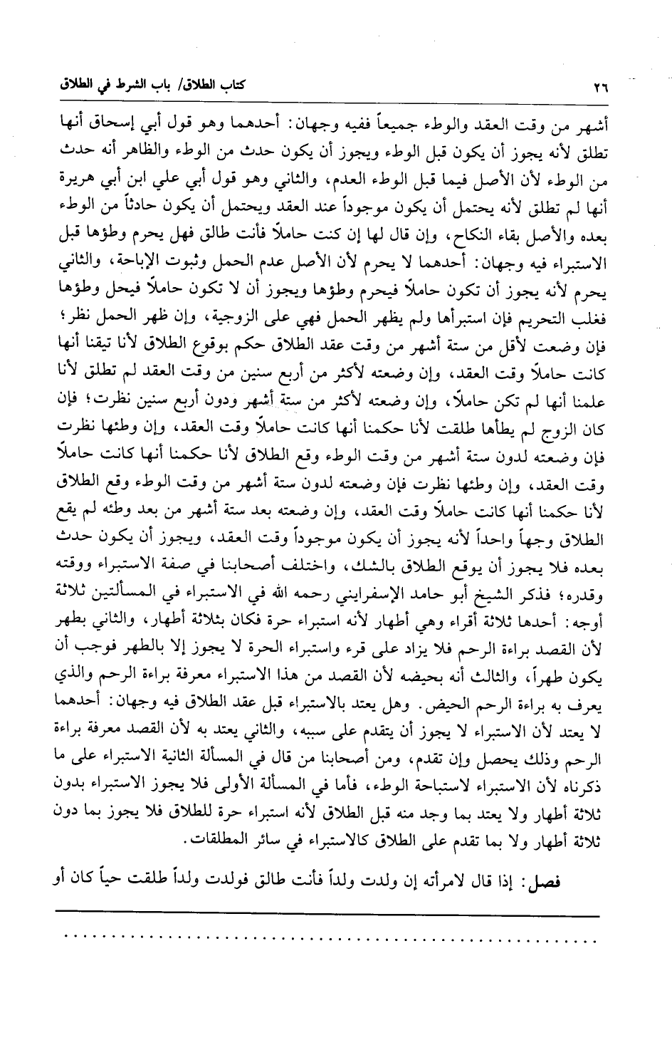 أشهر من وقت العقد والوطء جميعا ففيه وجهان: أحدهما: وهو قول أبي إسحاق أنها تطلق لأنه يجوز أن يكون قبل الوطء ويجوز أن يكون حدث من الوطء والظاهر أنه حدث من الوطء لأن الأصل فيما قبل الوطء العدم والثاني: وهو قول أبي علي ابن أبي هريرة أنها لم تطلق لأنه يحتمل أن يكون موجودا عند العقد ويحتمل أن يكون حادثا من الوطء بعده والأصل بقاء النكاح وإن قال لها إن كنت حاملاً فأنت طالق فهل يحرم وطؤها قبل الاستبراء فيه وجهان: أحدهما: لا يحرم لأن الأصل عدم الحمل وثبوت الإباحة والثاني: يحرم لأنه يجوز أن تكون حاملاً فيحرم وطؤها ويجوز أن لا تكون حاملاً فيحل وطؤها فغلب التحريم فإن استبرأها ولم يظهر الحمل فهي على الزوجية وإن ظهر الحمل نظر فإن وضعت لأقل من ستة أشهر من وقت عقد الطلاق حكم بوقوع الطلاق لأنا تيقنا أنها كانت حاملاً وقت العقد وإن وضعته لأكثر من أربع سنين من وقت العقد لم تطلق لأنا علمنا أنها لم تكن حاملا وإن وضعته لأكثر من ستة أشهر ودون أربع سنين نظرت فإن كان الزوج لم يطأها طلقت لأنا حكمنا أنها كانت حاملاً وقت العقد وإن وطئها نظرت فإن وضعته لدون ستة أشهر من وقت الوطء وقع الطلاق لأنا حكمنا أنها كانت حاملا وقت العقد وإن وطئها نظرت فإن وضعته لدون ستة أشهر من وقت الوطء وقع الطلاق لأنا حكمنا أنها كانت حاملاً وقت العقد وإن وضعته بعد ستة أشهر من بعد وطئه لم يقع الطلاق وجهاً واحداً لأنه يجوز أن يكون موجودا وقت العقد ويجوز أن يكون حدث بعده فلا يجوز أن يوقع الطلاق بالشك واختلف أصحابنا في صفة الاستبراء ووقته وقدره وذكر الشيخ أبو حامد الاسفرايني رحمه الله في الاستبراء في المسألتين ثلاثة أوجه: أحدها ثلاثة أقراء وهي أطهار لأنه استبراء حرة فكان بثلاثة أطهار والثاني: بطهر لأن القصد براءة الرحم فلا يزاد على قرء واستبراء الحرة لا يجوز إلا بالطهر فوجب أن يكون طهرا والثالث أنه بحيضه لأن القصد من هذا الاستبراء معرفة براءة الرحم والذي يعرف به براءة الرحم الحيض وهل يعتد بالاستبراء قبل عقد الطلاق ففيه وجهان: أحدهما: لا يعتد لأن الاستبراء لا يجوز أن يتقدم على سببه والثاني: يعتد به لأن القصد معرفة براءة الرحم وذلك يحصل وإن تقدم ومن أصحابنا من قال في المسألة الثانية: الاستبراء على ما ذكرناه لأن الاستبراء لاستباحة الوطء فأما في المسألة الأولى فلا يجوز الاستبراء بدون ثلاثة أطهار ولا يعتد بما وجد منه قبل الطلاق لأنه استبراء حرة للطلاق فلا يجوز بما دون ثلاثة أطهار ولا بما تقدم على الطلاق كالاستبراء في سائر المطلقات.