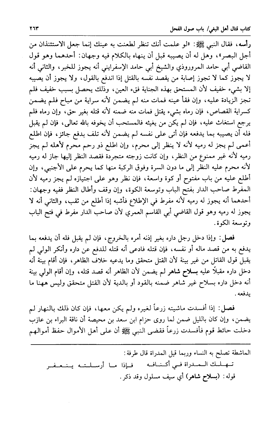 رأسه فقال النبي صلى الله عليه وسلم: "لو علمت أنك تنظر لطعنت به عينك إنما جعل الاستئذان من أجل البصر". وهل له أن يصيبه قبل أن ينهاه بالكلام فيه وجهان: أحدهما: وهو قول القاضي أبي حامد المروروذي والشيخ أبي حامد الإسفرايني أنه يجوز للخبر والثاني: أنه لا يجوز كما لا تجوز إصابة من يقصد نفسه بالقتل إذا اندفع بالقول ولا يجوز أن يصيبه إلا بشيء خفيف لأن المستحق بهذه الجناية فقء العين وذلك يحصل بسبب خفيف فلم تجز الزيادة عليه وإن فقأ عينه فمات منه لم يضمن لأنه سراية من مباح فلم يضمن كسرية القصاص فإن رماه بشيء يقتل فمات منه ضمنه لأنه قتله بغير حق وإن رماه فلم يرجع استغاث عليه فإن لم يكن من يغيثه فمن المستحب أن يخوفه بالله تعالى فإن لم يقبل فله أن يصيبه بما يدفعه فإن أتى على نفسه لم يضمن لأنه تلف بدفع جائز فإن اطلع أعمى لم يجز له رميه لأته لا ينظر إلى محرم وإن اطلع ذو رحم محرم لأهله لم يجز رميه لأنه غير ممنوع النظر وإن كانت زوجته متجردة فقصد النظر إليها جاز له رميه لأنه محرم عليه النظر إلى ما دون السرة وفوق الركبة منها كما يحرم على الأجنبي وإن اطلع عليه من باب مفتوح أو كوة واسعة فإن نظر وهو على اجتيازه لم يجز رميه لأنه المفرط صاحب الدار بفتح الباب وتوسعة الكوة وإن وقف وأطال النظر ففيه وجهان: أحدهما: أنه يجوز له رميه لأنه مفرط في الإطلاع فأشبه إذا اطلع من ثقب والثاني: أنه لا يجوز له رميه وهو قول القاضي أبي القاسم العمري لأن صاحب الدار مفرط في فتح الباب وتوسعة الكوة.