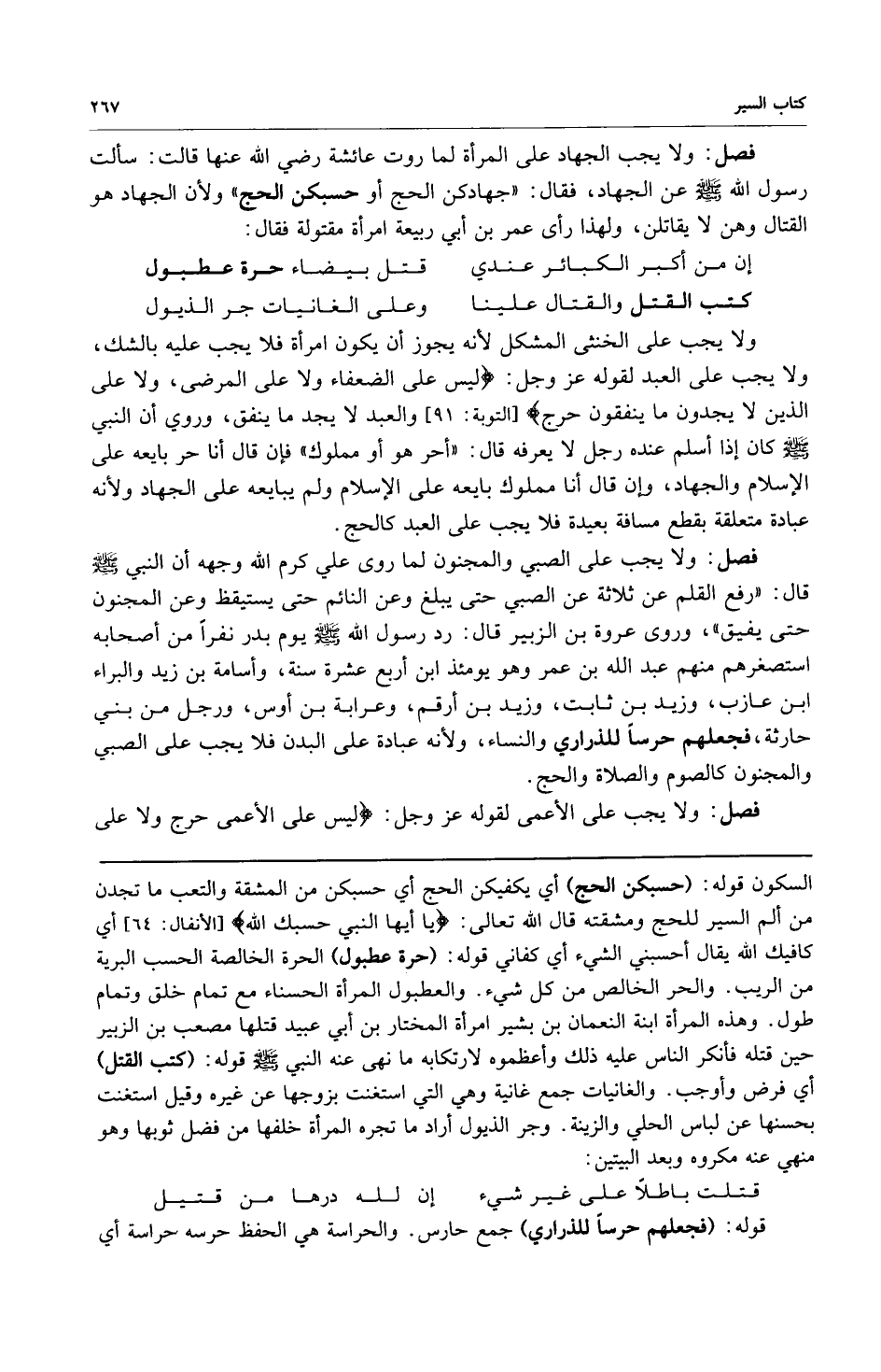 فصل: ولا يجب الجهاد على المرأة لما روت عائشة رضي الله عنه قالت: سألت رسول الله صلى الله عليه وسلم عن الجهاد فقال: "جهادكن الحج أو حسبكن الحج". ولأن الجهاد هو القتال وهن لا يقاتلن ولهذا رأى عمر بن أبي ربيعة امرأة مقتولة فقال: