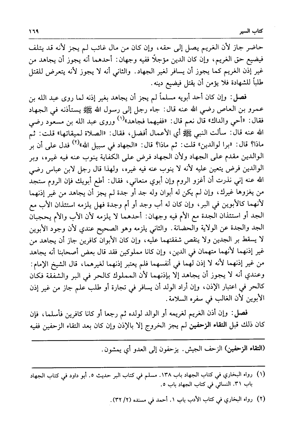 فصل: وإن كان أحد أبويه مسلماً لم يجز أن يجاهد بغير إذنه لما روى عبد الله بن عمرو بن العاص رضي الله عنه قال: جاء رجل إلى رسول الله صلى الله عليه وسلم يستأذنه في الجهاد فقال: "أحي والداك" قال: نعم فقال: "ففيهما فجاهد"1. وروى عبد الله بن مسعود رضي الله عنه قال: سألت النبي صلى الله عليه وسلم أي الأعمال أفضل؟ فقال: "الصلاة لميقاتها" قلت ثم ماذا؟ فقال: "بر الوالدين" قلت: ثم ماذا؟ قال: "الجهاد في سبيل الله" 2. فدل على أن بر الوالدين مقدم على الجهاد ولأن الجهاد فرض على الكفاية ينوب عنه فيه غيره وبر الوالدين فرض يتعين عليه لأنه لا ينوب عنه فيه غيره ولهذا قال رجل لابن عباس رضي الله عنه إني نذرت أن أغزو الروم وإن أبوي منعاني فقال: أطع أبويك فإن الروم ستجد من يغزوها غيرك وإن لم يكن له أبوان وله جد أو جدة لم يجز أن يجاهد من غير إذنهما لأنهما كالأبوين في البر وإن كان له أب وجد أو أم وجدة فهل يلزمه استئذان الأب مع الحد أو استئذان الجدة مع الأم فيه وجهان: أحدهما: لا يلزمه لأن الأب والأم يحجبان الجد والجدة عن الولاية والحضانة والثاني: يلزمه وهو الصحيح عندي لأن وجود الأبوين لا يسقط بر الجدين ولا ينقص شفقتهما عليه وإن كان الأبوان كافرين جاز أن يجاهد من غير إذنهما لأنهما متهمان في الدين وإن كانا مملوكين فقد قال بعض أصحابنا أنه يجاهد من غير إذنهما لأنه لا إذن لهما في أنفسهما فلم يعتبر إذنهما لغيرهما قال الشيخ الإمام: وعندي أنه لا يجوز أن يجاهد إلا بإذنهما لأن المملوك كالحر في البر والشفقة فكان كالحر في اعتبار الإذن وان أراد الولد أن يسافر في تجارة أوفي طلب علم جاز من غير إذن الأبوين لأن الغالب في سفره السلامة.