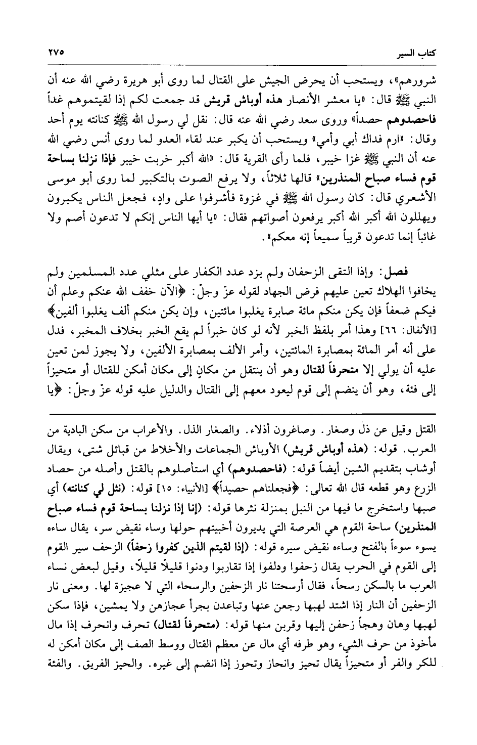 شرورهم". ويستحب أن يحرض الجيش على القتال لما روى أبو هريرة رضي الله عنه أن النبي صلى الله عليه وسلم قال: "يا معشر الأنصار هذه أوباش قريش قد جمعت لكم إذا لقيتموهم غداً فاحصدوهم حصدا". وروى سعد رضي الله عنه قال: نقل لي رسول الله صلى الله عليه وسلم كنانته يوم أحد وقال: "ارم فداك أبي وأمي". ويستحب أن يكبر عند لقاء العدو لما روى أنس رضي الله عنه أن النبي صلى الله عليه وسلم غزا خيبر فلما رأى القرية قال: "الله أكبر خربت خيبر فإذا نزلنا بساحة قوم فساء صباح المنذرين". قالها ثلاثا ولا يرفع الصوت بالتكبير لما روى أبو موسى الأشعري قال: كان رسول الله صلى الله عليه وسلم في غزوة فأشرفوا على واد فجعل الناس يكبرون ويهللون الله أكبر الله أكبر يرفعون أصواتهم فقال: "يا أيها الناس إنكم لا تدعون أصم ولا غائباً إنما تدعون قريباً سميعاً إنه معكم".