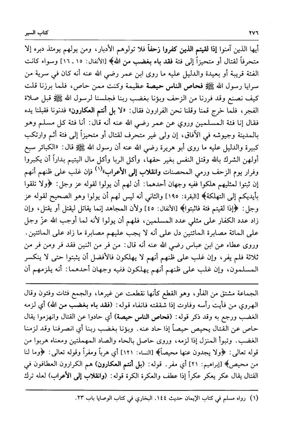 أَيُّهَا الَّذِينَ آمَنُوا إذا لَقِيتُمُ الَّذِينَ كَفَرُوا زَحْفاً فَلا تُوَلُّوهُمُ الْأَدْبَارَ َمَنْ يُوَلِّهِمْ يَوْمَئِذٍ دُبُرَهُ إِلَّا مُتَحَرِّفاً لِقِتَالٍ أَوْ مُتَحَيِّزاً إِلَى فِئَةٍ فَقَدْ بَاءَ بِغَضَبٍ مِنَ الله} [الأنفال: 15 - 16] وسواء كانت الفئة قريبة أو بعيدة والدليل عليه ما روى ابن عمر رضي الله عنه أنه كان في سرية من سرايا رسول الله صلى الله عليه وسلم فحاص الناس حيصة عظيمة وكنت ممن حاص فلما برزنا قلت كيف نصنع وقد فررنا من الزحف وبؤنا بغضب ربنا فجلسنا لرسول الله صلى الله عليه وسلم قبل صلاة الفجر فلما خرج قمنا وقلنا نحن الفرارون فقال: "لا بل أنتم العكارون" فدنونا فقبلنا يده فقال إنا فئة المسلمين وروي عن عمر رضي الله عنه أنه قال: أنا فئة كل مسلم وهو بالمدينة وجيوشه في الآفاق إن ولى غير متحرف لقتال أو متحيزا إلى فئة أثم وارتكب كبيرة والدليل عليه ما روى أبو هريرة رضي الله عنه أن رسول الله صلى الله عليه وسلم قال: "الكبائر سبع أولهن الشرك بالله وقتل النفس بغير حقها وأكل الربا وأكل مال اليتيم بدارا أن يكبروا وفرار يوم الزحف ورمي المحصنات وانقلاب الى الأعراب" 1. فإن غلب على ظنهم أنهم إن ثبتوا لمثليهم هلكوا ففيه وجهان: أحدهما: أن لهم أن يولوا لقوله عز وجل: {وَلا تُلْقُوا بِأَيْدِيكُمْ إِلَى التَّهْلُكَةِ} [البقرة: 195] والثاني: أنه ليس لهم أن يولوا وهو الصحيح لقوله عز وجل: {إذا لَقِيتُمْ فِئَةً فَاثْبُتُوا} [الأنفال: 45] ولأن المجاهد إنما يقاتل ليقتل أو يقتل وإن زاد عدد الكفار على مثلي عدد المسلمين فلهم أن يولوا لأنه لما أوجب الله عز وجل على المائة مصابرة المائتين دل على أنه لا يجب عليهم مصابرة ما زاد على المائتين وروى عطاء عن ابن عباس رضي الله عنه أنه قال: من فر من اثنين فقد فر ومن فر من ثلاثة فلم يفر وإن غلب على ظنهم أنهم لا يهلكون فالأفضل أن يثبتوا حتى لا ينكسر المسلمون وان غلب على ظنهم أنهم يهلكون ففيه وجهان أحدهما: أنه يلزمهم أن