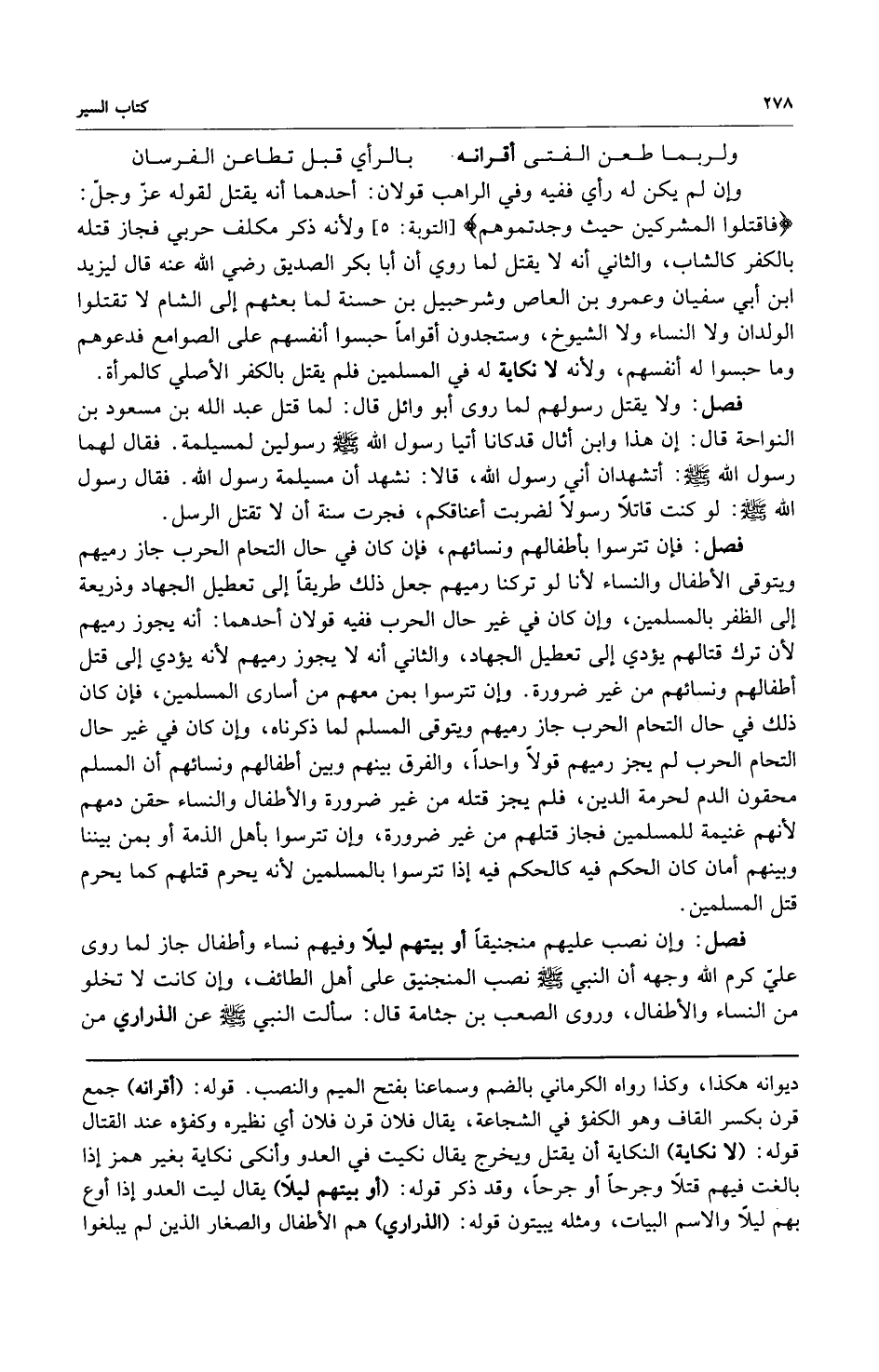 فصل: وإن نصب عليهم منجنيقا أو بيتهم ليلا وفيهم النساء والأطفال جاز لما روى علي كرم الله وجهه أن النبي صلى الله عليه وسلم نصب المنجنيق على أهل الطائف وإن كانت لا تخلو من النساء والأطفال وروى الصعب بن جثامة قال: سألت النبي صلى الله عليه وسلم عن الذراري من