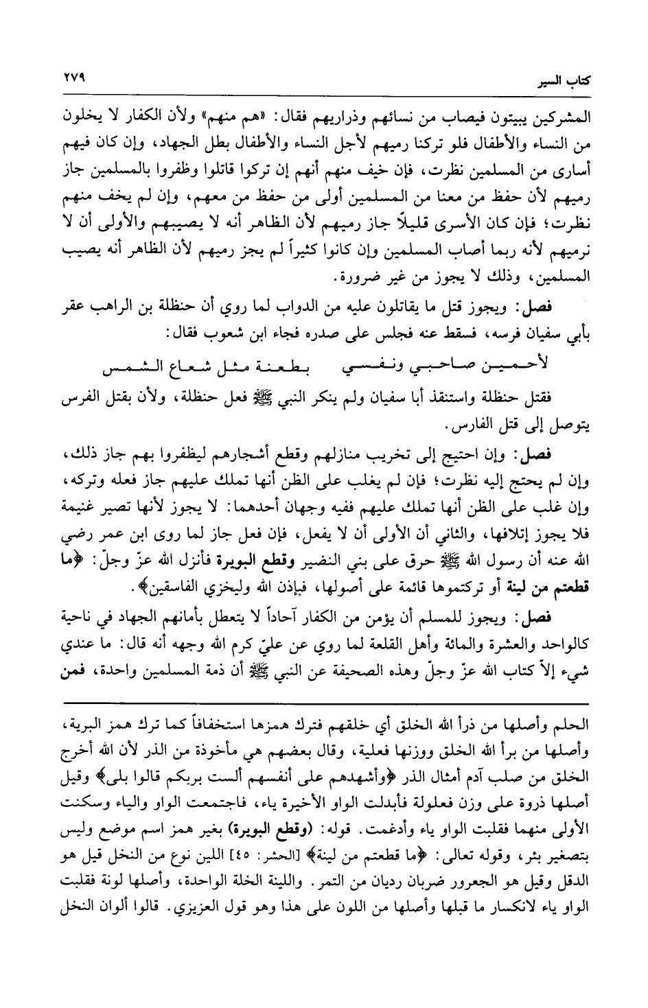 فصل: وان احتيج إلى تخريب منازلهم وقطع أشجارهم ليظفروا بهم جاز ذلك وإن لم يحتج إليه نظرت فإن لم يغلب على الظن أنها تملك عليهم جاز فعله وتركه وإن غلب على الظن أنها تملك عليهم ففيه وجهان أحدهما: لا يجوز لأنها تصير غنيمة فلا يجوز إتلافها والثاني: أن الأولى أن لا يفعل فإن فعل جاز لما روى ابن عمر رضي الله عنه أن رسول الله صلى الله عليه وسلم حرق على بني النضير وقطع البويرة فأنزل الله عز وجل: {مَا قَطَعْتُمْ مِنْ لِينَةٍ أَوْ تَرَكْتُمُوهَا قَائِمَةً عَلَى أُصُولِهَا فَبِإِذْنِ الله وَلِيُخْزِيَ الْفَاسِقِينَ} .