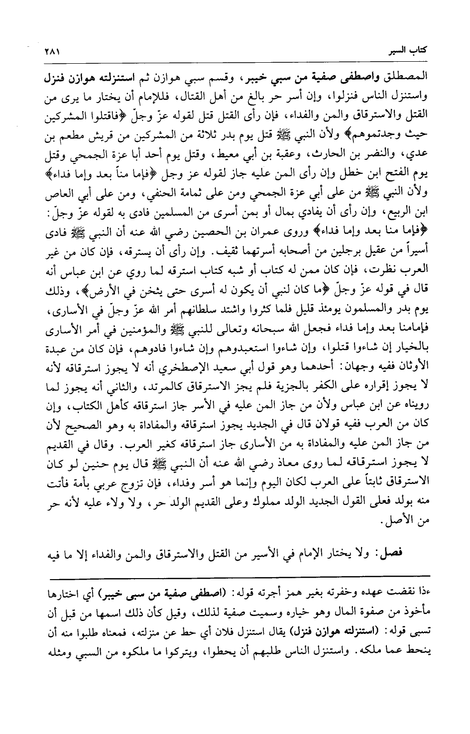 المصطلق واصطفى صفية من سبي خيبر وقسم سبي هوازن ثم استنزلته هوازن فنزل واستنزا الناس فنزلوا وإن أسر حر بالغ من أهل القتال فللإمام أن يختار ما يرى من القتل أو الاسترقاق والمن والفداء فإن رأى القتل قتل لقوله عز وجل: {فَاقْتُلُوا الْمُشْرِكِينَ حَيْثُ وَجَدْتُمُوهُمْ} ولأن النبي صلى الله عليه وسلم قتل يوم بدر ثلاثة من المشركين من قريش مطعم بن عدي والنضر بن الحارث وعقبة بن أبي معيط وقتل يوم أحد أبا عزة الجمحي وقتل يوم الفتح ابن خطل وإن رأى المن عليه جاز لقوله عز وجل: {فَإِمَّا مَنّاً بَعْدُ وَإِمَّا فِدَاءً} ولأن النبي صلى الله عليه وسلم من على أبي عزة الجمحي ومن على ثمامة الحنفي ومن على أبي العاص ابن الربيع وإن رأى أن يفادي بمال أو بمن أسرى من المسلمين فادى به لقوله عز وجل: {فَإِمَّا مَنّاً بَعْدُ وَإِمَّا فِدَاءً} وروى عمران بن الحصين رضي الله عنه أن النبي صلى الله عليه وسلم فادى أسيراً من عقيل برجلين من أصحابه أسرتهما ثقيف وإن رأى أن يسترقه فإن كان من غير العرب نظرت فإن كان ممن له كتاب أوشبه كتاب استرقه لما روي عن ابن عباس أنه قال في قوله عز وجل: {مَا كَانَ لِنَبِيٍّ أَنْ يَكُونَ لَهُ أَسْرَى حَتَّى يُثْخِنَ فِي الْأَرْضِ} وذلك يوم بدر والمسلمين يومئذ قليل فلما كثروا واشتد سلطانهم أمر الله عز وجل في الأسارى فإما منا بعد وإما فداء فجعل الله سبحانه وتعالى للنبي صلى الله عليه وسلم والمؤمنين في أمر الأسارى بالخيار إن شاءوا قتلوا وإن شاءوا استعبدوهم وإن شاءوا فادوهم فإن كان من عبدة الأوثان ففيه وجهان أحدهما: وهو قول أبي سعيد الإصطخري أنه لا يجوز استرقاقهم لأنه لا يجوز إقراره على الكفر بالجزية فلم يجز الاسترقاق كالمرتد والثاني: أنه يجوز لما رويناه عن ابن عباس ولأن من جاز المن عليه في الأسر جاز استرقاقه كأهل الكتاب وإن كان من العرب ففيه قولان قال في الجديد يجوز استرقاقه والمفاداة به وهو الصحيح لأن من جاز المن عليه والمفاداة به من الأسارى جاز استرقاقه كغير الغرب وقال في القديم لا يجوز استرقاقه لما روى معاذ رضي الله عنه أن النبي صلى الله عليه وسلم قال يوم حنين لو كان استرقاق ثابتاً على العرب لكان اليوم وإنما هو أسر وفداء فإن تزوج عربي بأمة فأتت منه بولد فعلى القول الجديد الولد مملوك وعلى القديم الولد حر ولا ولاء عليه لأنه حر من الأصل.