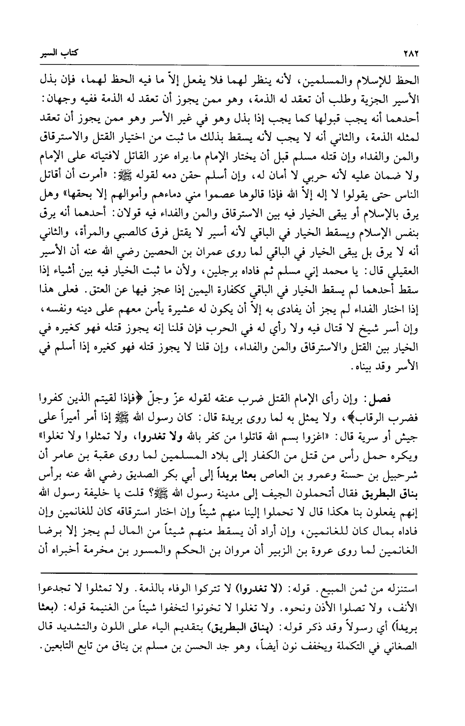 فصل: وإن رأى الإمام القتل ضرب عنقه لقوله عز وجل: {فَإذا لَقِيتُمُ الَّذِينَ كَفَرُوا فَضَرْبَ الرِّقَابِ} ولا يمثل به لما روى بريدة قال: كان رسول الله صلى الله عليه وسلم إذا أمر أميراً على جيش أو سرية قال: "اغزوا بسم الله قاتلوا من كفر بالله ولا تغدروا ولا تمثلوا ولا تغلوا". ويكره حمل رأس من قتل من الكفار الى بلاد المسلمين لما روى عقبة بن عامر أن شرحبيل بن حسنة وعمرو بن العاص بعثا بريداً إلى أبي بكر الصديق رضي الله عنه برأس بناق البطريق فقال أتحملون الجيف الى مدينة رسول الله صلى الله عليه وسلم؟ قلت يا خليفة رسول الله إنهم يفعلون بنا هكذا قال لا تحملوا منهم إلينا شيئا وإن اختار استرقاقه كان للغانمين وإن فاداه بمال كان للغانمين وإن أراد أن يسقط منهم شيئاً من المال لم يجز الا برضا الغانمين لما روى عروة بن الزبير أن مروان بن الحكم والمسور بن مخرمة أخبراه أن