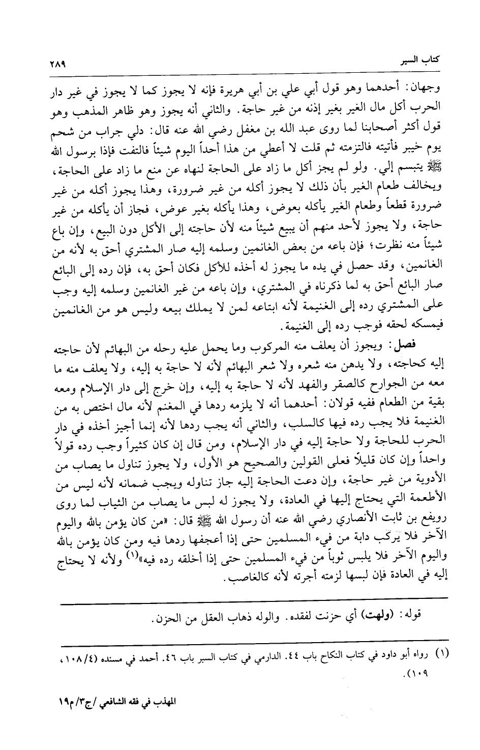 فصل: ويجوز أن يعلف منه المركوب وما يحمل عليه رحله من البهائم لأن حاجته إليه كحاجته ولا يدهن منه شعره ولا شعر البهائم لأنه لا حاجة به إليه ولا يعلف منه ما معه من الجوارح كالصقر والفهد لأنه لا حاجة به إليه وإن خرج إلى دار الإسلام ومعه بقية من الطعام ففيه قولان: أحدهما: أنه لا يلزمه ردها في المغنم لأنه مال اختص به من الغنيمة فلا يجب رده فيها كالسلب والثاني: أنه يجب ردها لأنه إنما أجيز أخذه في دار الحرب للحاجة ولا حاجة إليه في دار الإسلام ومن قال إن كان كثيراً وجب رده قولاً واحداً وإن كان قليلاً فعلى القولين والصحيح هو الأول ولا يجوز تناول ما يصاب من الأدوية من غير حاجة وإن دعت الحاجة إليه جاز تناوله ويجب ضمانه لأنه ليس من الأطعمة التي يحتاج إليها في العادة ولا يجوز له لبس ما يصاب من الثياب لما روى رويفع بن ثابت الأنصاري رضي الله عنه أن رسول الله صلى الله عليه وسلم قال: "من كان يؤمن بالله واليوم الآخر فلا يركب دابة من فيء المسلمين حتى إذا أعجفها ردها فيه ومن كان يؤمن بالله واليوم الآخر فلا يلبس ثوباً من فيء المسلمين حتى إذا أخلقه رده فيه" 1. ولأنه لا يحتاج إليه في العادة فإن لبسها لزمته أجرته لأنه كالغاصب.