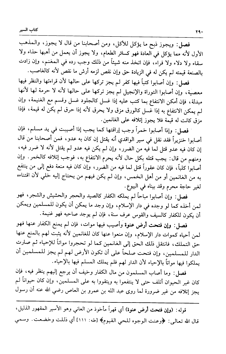 فصل ك وإن أصابوا كتباً فيها كفر لم يجز تركها على حالها لأن قراءتها والنظر فيها معصية وإن أصابوا كتباً والإنجيل لم يجز تركها على حالها أنه لا حرمة لها لأنها مبدلة فإن أمكن الانتفاع بما كتب عليه إذا غسل كالجلود غسل وقسم مع الغنيمة وإن لم يمكن الانتفاع به إذا غسل كالورق مزق ولا يحرق لأنه إذا حرق لم يكن له قيمة فإذا مزق كانت له قيمة فلا يجوز إتلافه على الغانمين.