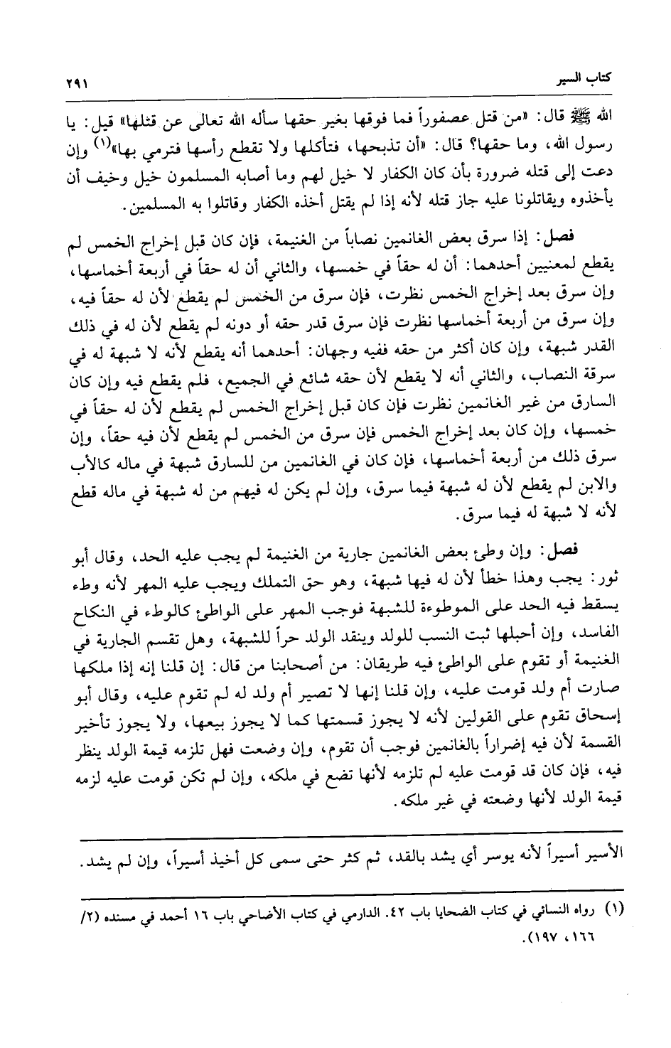 الله صلى الله عليه وسلم قال: "من قتل عصفوراً فما فوقها بغير حقها سأله الله تعالى عن قتلها قيل: يا رسول الله وما حقها؟ قال: أن تذبحها فتأكلها ولا تقطع رأسها فترمي بها" 1 وإن دعت إلى قتله ضرورة بأن كان الكفار لا خيل لهم وما أصابه المسلمون خيل وخيف أن يأخذوه ويقاتلونا علي جاز قتله لأنه إذا لم يقتل أخذه الكفار وقاتلوا به المسلمين.