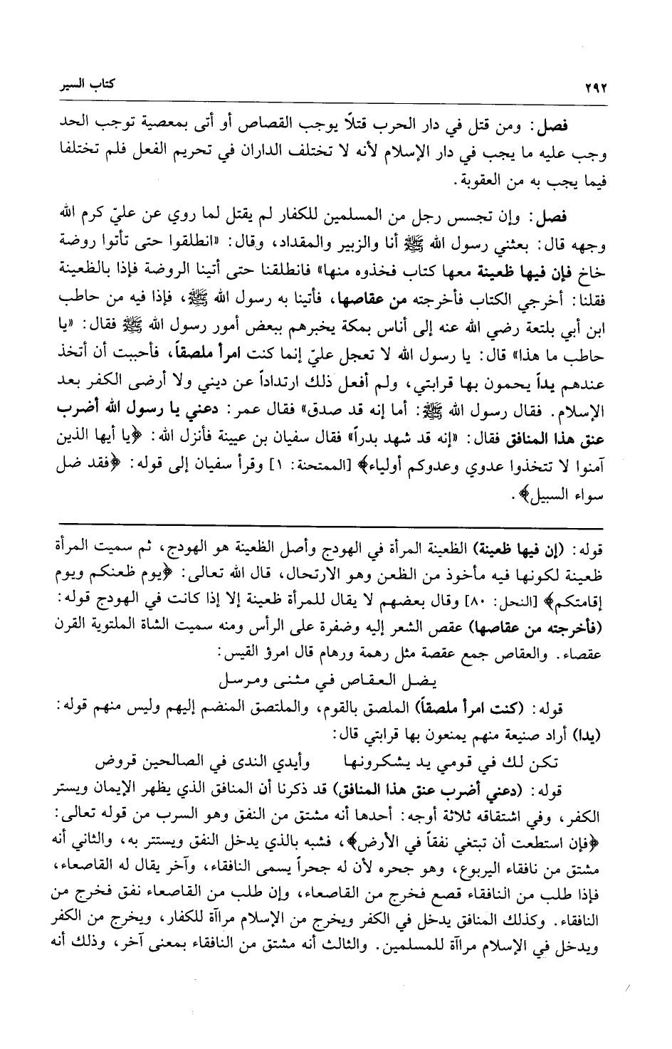فصل: وإن تجسس رجل من المسلمين للكفار لم يقتل لما روي عن علي كرم الله وجهه قال: بعثني رسول الله صلى الله عليه وسلم أنا والزبير والمقداد وقال: "انطلقوا حتى تأتوا روضة خاخ فإن فيها ظعينة معها كتاب فخذوه منها" فانطلقنا حتى أتينا الروضة فإذا بالظعينة فقلنا: أخرجي الكتاب فأخرجته من عقاصها فأتينا به رسول الله صلى الله عليه وسلم فإذا فيه من حاطب ابن أبي بلتعة رضي الله عنه إلى أناس بمكة يخبرهم ببعش أمور رسول الله صلى الله عليه وسلم فقال: "يا حاطب ما هذا" قال: يا رسول الله لا تعجل علي إنما كنت امرأ ملصقاً فأحببت أن أتخذ عندهم يداً يحمون بها قرابتي ولم أفعل ذلك ارتداداً عن ديني ولا أرضى الكفر بعد الإسلام فقال رسول الله صلى الله عليه وسلم: "أما إنه قد صدق" فقال عمر: دعني يا رسول الله أضرب عنق هذا المنافق فقال: "إنه قد شهد بدراً" فقال سفيان بن عيينة فأنزل الله: {يَا أَيُّهَا الَّذِينَ آمَنُوا لا تَتَّخِذُوا عَدُوِّي وَعَدُوَّكُمْ أَوْلِيَاءَ} [الممتحنة: 1] وقرأ سفيان إلى قوله: {فَقَدْ ضَلَّ سَوَاءَ السَّبِيلِ} .