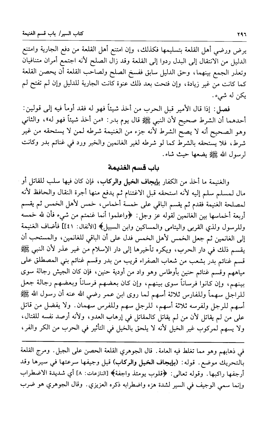 والغنيمة ما أخذ من الكفار بإيجاف الخيل والركاب فإن كان فيها سلب للقاتل أو مال لمسلم سلم إليه لأنه استحقه قبل الاغتنام ثم يدفع منها أجرة النقال والحافظ لأنه لمصلحة الغنيمة فقدم ثم يقسم الباقي على خمسة أخماس خمس لأهل الخمس ثم يقسم أربعة أخماسها بين الغانمين لقوله عز وجل {وَاعْلَمُوا أَنَّمَا غَنِمْتُمْ مِنْ شَيْءٍ فَأَنَّ لِلَّهِ خُمُسَهُ وَلِلرَّسُولِ وَلِذِي الْقُرْبَى وَالْيَتَامَى وَالْمَسَاكِينِ وَابْنِ السَّبِيلِ} [الأنفال: 41] فأضاف الغنيمة إلى الغانمين ثم جعل الخمس لأهل الخمس فدل على أن الباقي للغانمين والمستحب أن يقسم ذلك في دار الحرب ويكره تأخيرها الى دار الإسلام من غير عذر لأن النبي صلى الله عليه وسلم قسم غنائم بدر بشعب من شعاب الصفراء قريب من بدر وقسم غنائم بني المصطلق على مياههم وقسم غنائم حنين بأو طاس وهو واد من أودية حنين فإن كان الجيش رجالة سوى بينهم وإن كانوا فرساناً سوى بينهم وإن كان بعضهم فرساناً وبعضهم رجالة جعل للراجل سهماً وللفارس ثلاثة أسهم لما روى ابن عمر رضي الله عنه أن رسول الله صلى الله عليه وسلم أسهم للرجل ولفرسه ثلاثة أسهم للرجل سهم وللفرس سهمان ولا يفضل من قاتل على من لم يقاتل لأن من لم يقاتل كالمقاتل في إرهاب العدو ولأنه أرصد نفسه للقتال ولا يسهم لمركوب غير الخيل لأنه لا يلحق بالخيل في التأثير في الحرب من الكر والفر،