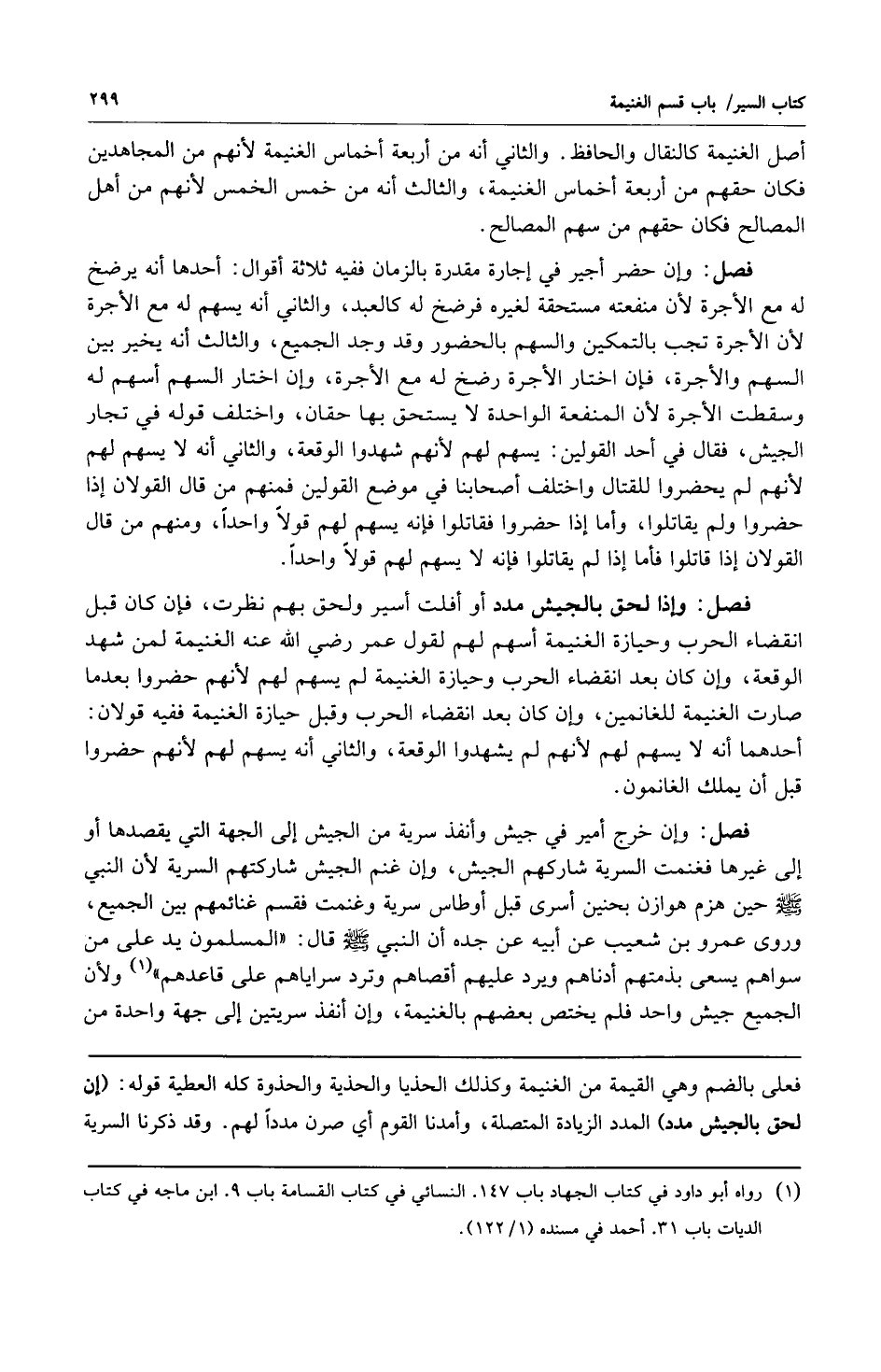 فصل: وإن خرج أمير في جيش وأنفذ سرية من الجيش إلى الجهة التي يقصدها أو إلى غيرها فغنمت السرية شاركهم الجيش وإن غنم الجيش شاركتهم السرية لأن النبي صلى الله عليه وسلم حين هزم هوازن بحنين أسرى قبل أوطاس سرية وغنمت فقسم غنائمهم بين الجميع وروى عمرو بن شعيب عن أبيه عن جده أن النبي صلى الله عليه وسلم قال: "المسلمون يد على من سواهم يسعى بذمتهم أدناهم ويرد عليهم أقصاهم وترد سراياهم على قاعدهم" 1. ولأن الجميع جيش واحد فلم يختص بعضهم بالغنيمة وإن أنفذ سريتين إلى جهة واحدة من