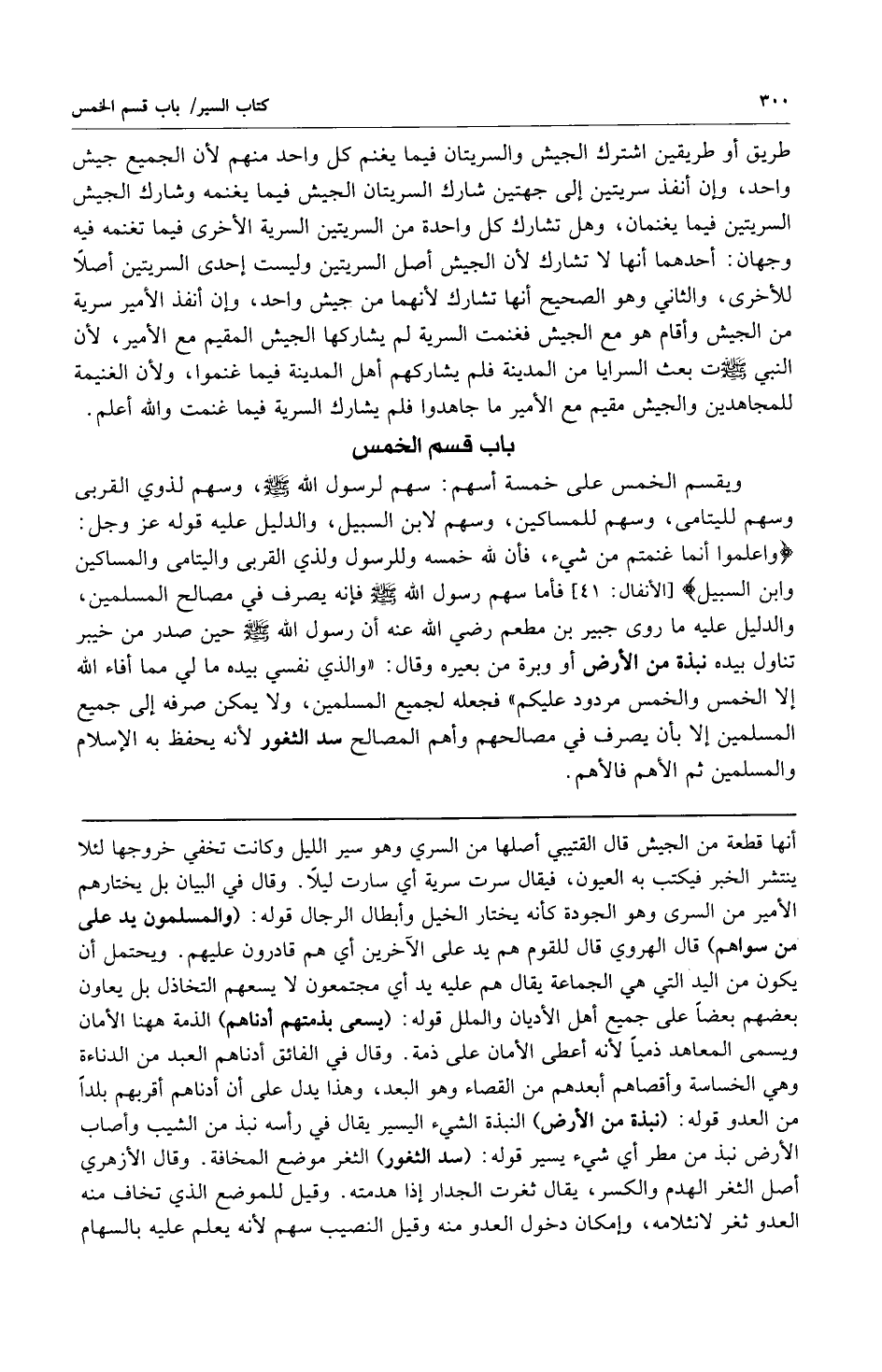 ويقسم الخمس على خمس أسهم: سهم لرسول الله صلى الله عليه وسلم وسهم لذوي القربى وسهم لليتامى وسهم للمساكين وسهم لابن السبيل والدليل عليه قوله عز وجل: {وَاعْلَمُوا أَنَّمَا غَنِمْتُمْ مِنْ شَيْءٍ فَأَنَّ لِلَّهِ خُمُسَهُ وَلِلرَّسُولِ وَلِذِي الْقُرْبَى وَالْيَتَامَى وَالْمَسَاكِينِ وَابْنِ السَّبِيلِ} [الأنفال: 41] فأما سهم رسول الله صلى الله عليه وسلم فإنه يصرف في مصالح المسلمين والدليل عليه ما روى جبير بن مطعم رضي الله عنه أن رسول الله صلى الله عليه وسلم حين صدر من خيبر تناول بيده نبذة من الأرض أو وبرة من بعيره وقال: "والذي نفسي بيده ما لي مما أفاء الله إلا الخمس والخمس مردود عليكم". فجعله لجميع المسلمين ولا يمكن صرفه إلى جميع المسلمين إلا بأن يصرف في مصالحهم وأهم المصالح سد الثغور لأنه يحفظ به الإسلام والمسلمين ثم الأهم فالأهم.