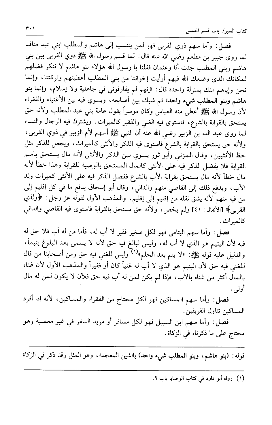 فصل: وأما سهم ذوي القربى فهو لمن ينتسب إلى هاشم والمطلب ابني عبد مناف لما روى جبير بن مطعم رضي الله عنه قال: لما قسم رسول الله صلى الله عليه وسلم ذوي القربى بين بني هاشم وبني المطلب جئت أنا وعثمان فقلنا يا رسول الله هؤلاء بنو هاشم لا ننكر فضلهم لمكانك الذي وضعك الله فيهم أرأيت إخواننا من بني المطلب أعطيتهم وتركتنا وإنما نحن وإياهم منك بمنزلة واحدة قال: "إنهم لم يفارقوني في جاهلية ولا إسلام وإنما بنو هاشم وبنو المطلب شيء واحد" ثم شبك بين أصابعه ويسوي فيه بين الأغنياء والفقراء لأن رسول الله صلى الله عليه وسلم أعطى منه العباس وكان موسراً يقول عامة بني عبد المطلب ولأنه حق يستحق بالقرابة بالشرع فاستوى فيه الغني والفقير كالميراث ويشترك فيه الرجال والنساء لما روى عبد الله بن الزبير رضي الله عنه أن النبي صلى الله عليه وسلم أسهم لأم الزبير في ذوي القربي ولأنه حق يستحق بالقرابة بالشرع فاستوى فيه الذكر والأنثى كالميراث ويجعل للذكر مثل حظ الأنثيين وقال المزني وأبو ثور يسوي بين الذكر والأنثى لأنه مال يستحق باسم القرابة فلا يفضل الذكر فيه على الأنثى كالمال المستحق بالوصية للقرابة وهذا خطأ لأنه مال خطأ لأنه مال يستحق بقرابة الأب بالشرع ففضل الذكر فيه على الأنثى كميراث ولد الأب ويدفع ذلك إلى القاصي منهم والداني وقال أبو إسحاق يدفع ما في كل إقليم إلى من فيه منهم لأنه يشق نقله من إقليم إلى إقليم والمذهب الأول لقوله عز وجل: {وَلِذِي الْقُرْبَى} [الأنفال: 41] ولم يخص ولأنه حق مستحق بالقرابة فاستوى فيه القاصي والداني كالميراث.