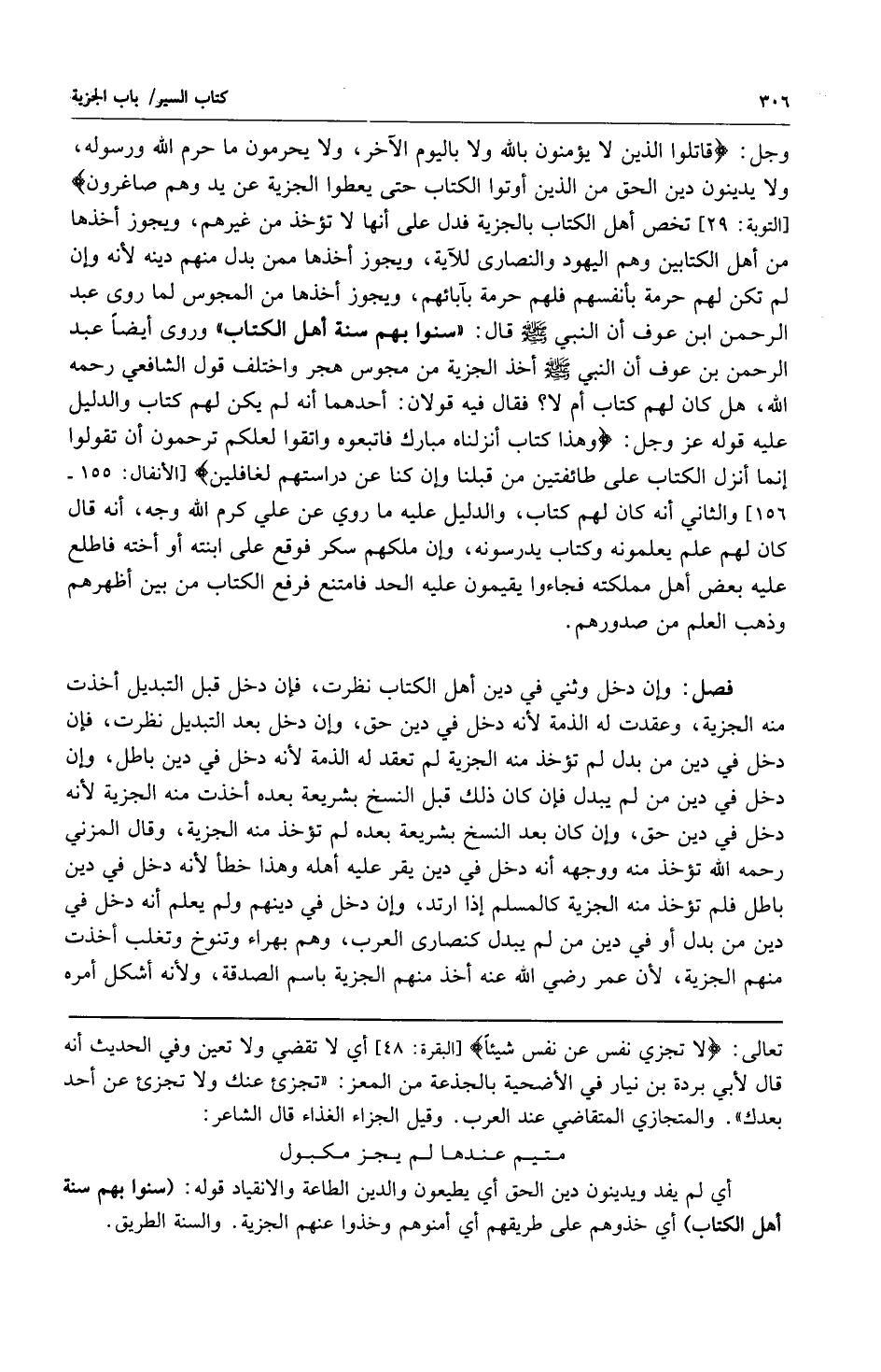 وجل: {قَاتِلُوا الَّذِينَ لا يُؤْمِنُونَ بِالله وَلا بِالْيَوْمِ الْآخِرِ وَلا يُحَرِّمُونَ مَا حَرَّمَ الله وَرَسُولُهُ وَلا يَدِينُونَ دِينَ الْحَقِّ مِنَ الَّذِينَ أُوتُوا الْكِتَابَ حَتَّى يُعْطُوا الْجِزْيَةَ عَنْ يَدٍ وَهُمْ صَاغِرُونَ} [التوبة: 29] تخص أهل الكتاب بالجزية فدل على أنهم لا تؤخذ من غيرهم ويجوز أخذها من أهل الكتابين وهم اليهود والنصارى للآية ويجوز أخذها ممن بدل منهم دينه لأنه وإن لم تكن لهم حرمة بأنفسهم فلهم حرمة بآبائهم ويجوز أخذها من المجوس لما روى عبد الرحمن ابن عوف أن النبي صلى الله عليه وسلم قال: "سنوا بهم سنة أهل الكتاب". وروى أيضاً عبد الرحمن بن عوف أن النبي صلى الله عليه وسلم أخذ الجزية من مجوس هجر واختلف قول الشافعي رحمه الله هل كان لهم كتاب أم لا؟ فقال فيه قولان: أحدهما: أنه لم يكن لهم كتاب والدليل عليه قوله عز وجل: {وَهَذَا كِتَابٌ أَنْزَلْنَاهُ مُبَارَكٌ فَاتَّبِعُوهُ وَاتَّقُوا لَعَلَّكُمْ تُرْحَمُونَ أَنْ تَقُولُوا إِنَّمَا أُنْزِلَ الْكِتَابُ عَلَى طَائِفَتَيْنِ مِنْ قَبْلِنَا وَإِنْ كُنَّا عَنْ دِرَاسَتِهِمْ لَغَافِلِينَ} [الأنفال: 155 - 156] والثاني: أنه كان لهم كتاب والدليل عليه ما روي عن علي كرم الله وجه أنه قال كان لهم علم يعلمونه وكتاب يدرسونه وإن ملكهم سكر فوقع على ابنته أو أخته فاطلع عليه بعض أهل مملكته فجاءوا يقيمون عليه الحد فامتنع فرفع الكتاب من بين أظهرهم وذهب العلم من صدورهم.