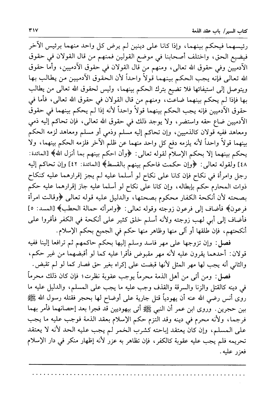 رئيسهما فيحكم بينهما وإذا كانا على دينين لم يرض كل واحد منهما برئيس الآخر فيضيع الحق واختلف أصحابنا في موضع القولين فمنهم من قال القولان في حقوق الآدميين وفي حقوق الله تعالى ومنهم من قال القولان في حقوق الآدميين وأما حقوق الله تعالى فإنه يجب الحكم بينهما قولاً واحداً لأن الحقوق الآدميين من يطالب بها ويتوصل إلى استيفائها فلا تضيع بترك الحكم بينهما وليس لحقوق الله تعالى من يطالب بها فإذا لم يحكم بينهما ضاعت ومنهم من قال القولان في حقوق الله تعالى فأما في حقوق الآدميين فإنه يجب الحكم بينهما قولاً واحداً لأنه إذا لم يحكم بينهما في حقوق الآدميين ضاع حقه واستضر ولا يوجد ذلك في حقوق الله تعالى فإن تحاكم إليه ذمي ومعاهد ففيه قولان كالذميين وإن تحاكم إليه مسلم وذمي أو مسلم ومعاهد لزمه الحكم بينهما قولاً واحداً لأنه يلزمه دفع كل واحد منهما عن ظلم الآخر فلزمه الحكم بينهما ولا يحكم بينهما إلا بحكم الإسلام لقوله تعالى: {وَأَنِ احْكُمْ بَيْنَهُمْ بِمَا أَنْزَلَ الله} [المائدة: 48] ولقوله تعالى: {وَإِنْ حَكَمْتَ فَاحْكُمْ بَيْنَهُمْ بِالْقِسْطِ} [المائدة: 42] وإن تحاكم إليه رجل وامرأة في نكاح فإن كانا على نكاح لو أسلما عليه لم يجز إقرارهما عليه كنكاح ذوات المحارم حكم بإبطاله وإن كانا على نكاح لو أسلما عليه جاز إقرارهما عليه حكم بصحته لأن أنكحة الكفار محكوم بصحتها والدليل عليه قوله تعالى {وَقَالَتِ امْرَأَتُ فِرْعَوْنَ} فأضاف إلى فرعون زوجته وقوله تعالى: {وَامْرَأَتُهُ حَمَّالَةَ الْحَطَبِ} [المسد: 5] فأضاف إلى أبي لهب زوجته ولأنه أسلم خلق كثير على أنكحة في الكفر فأقروا على أنكحتهم فإن طلقها أو آلى منها وظاهر منها حكم في الجميع بحكم الإسلام.