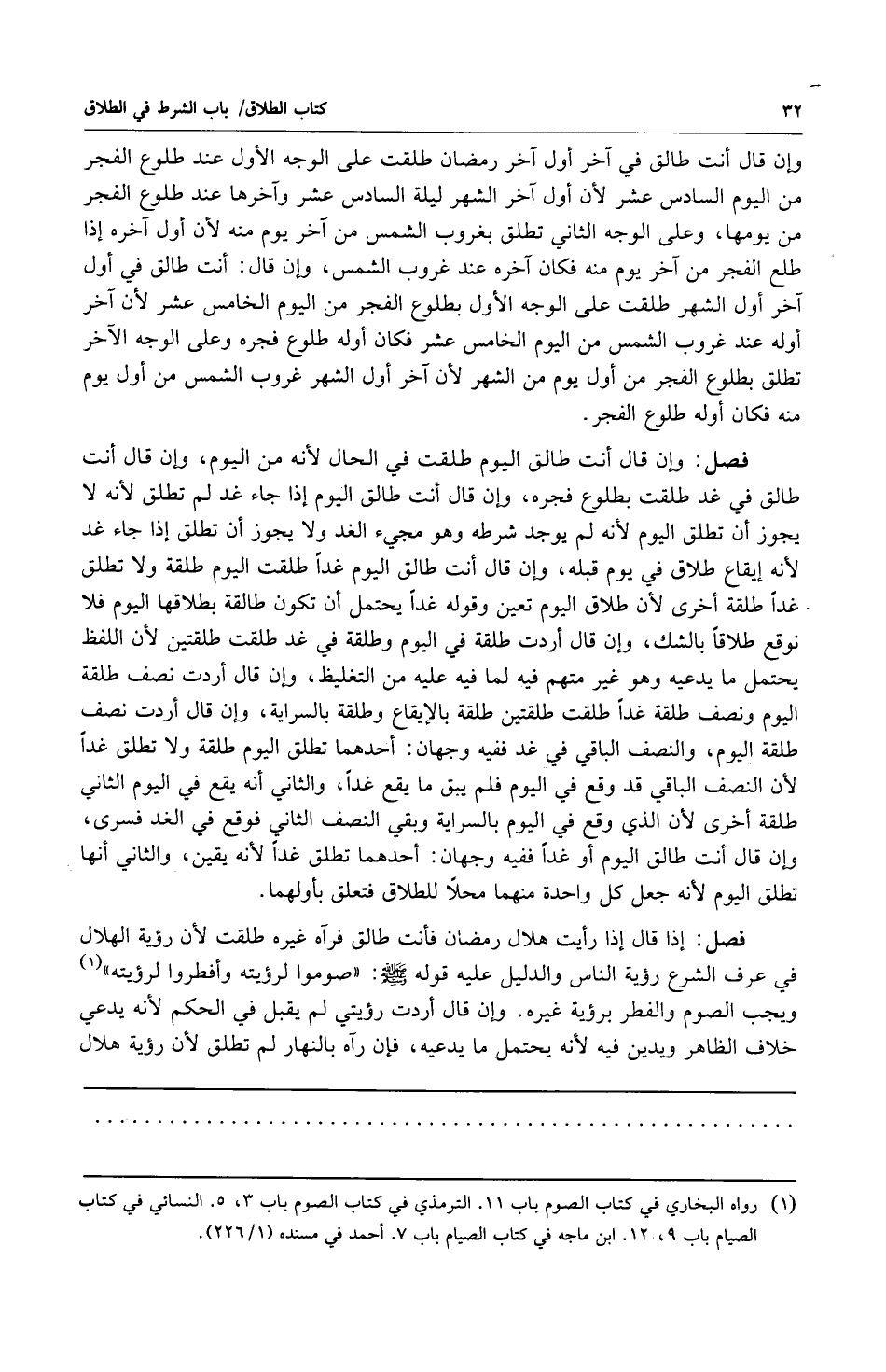 فصل: إذا قال إذا رأيت هلال رمضان فأنت طالق فرآه غيره طلقت لأن رؤية الهلال في عرف الشرع رؤية الناس والدليل عليه قوله صلى الله عليه وسلم: "صوموا لرؤيته وأفطروا لرؤيته"1. ويجب الصوم والفطر برؤية غيره وإن قال أردت رؤيتي لم يقبل في الحكم لأنه يدعي خلاف الظاهر ويدين فيه لأنه يحتمل ما يدعيه فإن رآه بالنهار لم تطلق لأن رؤية هلال