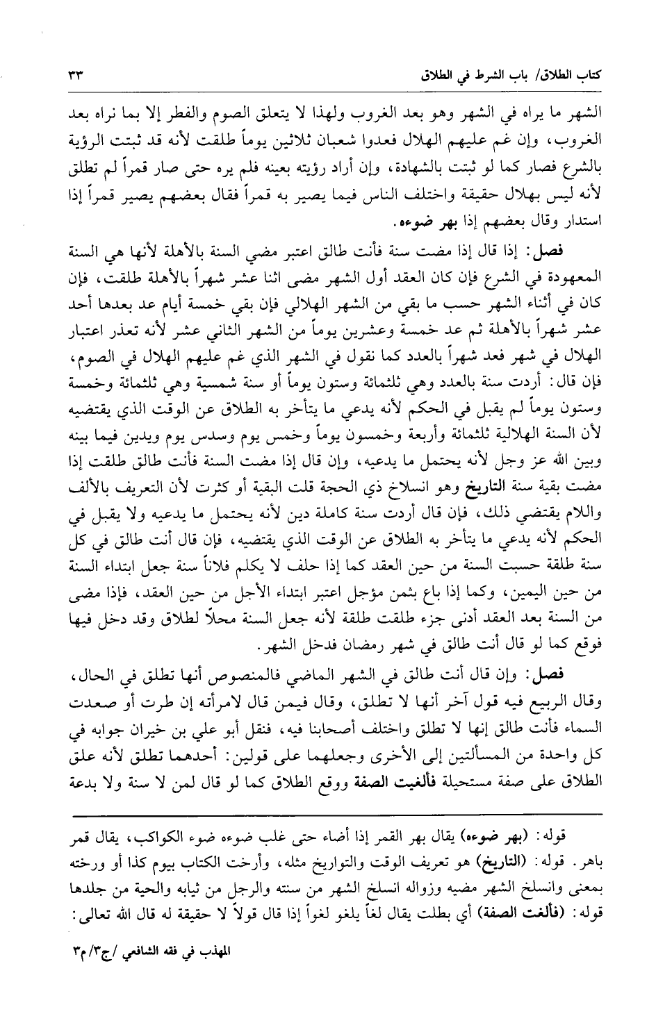فصل: إذا قال إذا مضت سنة فأنت طالق اعتبر مضي السنة بالأهلة لأنها هي السنة المعهودة في الشرع فإن كان العقد أول الشهر مضى اثنا عشر شهراً بالأهلة طلقت فإن كان في أثناء الشهر حسب ما بقي من الشهر الهلالي فإن بقي خمسة أيام عد بعدها أحد عشر شهراً بالأهلة ثم عد خمسة وعشرين يوماً من الشهر الثاني عشر لأنه تعذر اعتبار الهلال في شهر فعد شهراً بالعدد كما نقول في الشهر الذي غم عليهم الهلال في الصوم فإن قال: أردت سنة بالعدد وهي ثلاثمائة وستون يوما أو سنة شمسية وهي ثلاثمائة وخمسة وستون يوماً لم يقبل في الحكم لأنه يدعي ما يتأخر به الطلاق عن الوقت الذي يقتضيه لأن السنة الهلالية ثلاثمائة وأربعة وخمسون يوما وخمس يوم وسدس يوم ويدين فيما بينه وبين الله عز وجل لأنه يحتمل ما يدعيه وإن قال إذا مضت السنة فأنت طالق طلقت إذا مضت بقية سنة التاريخ وهو انسلاخ ذي الحجة قلت البقية أو كثرت لأن التعريف بالألف واللام يقتضي ذلك فإن قال أردت سنة كاملة دين لأنه يحتمل ما يدعيه ولا يقبل في الحكم لأنه يدعي ما يتأخر به الطلاق عن الوقت الذي يقتضيه فإن قال أنت طالق في كل سنة طلقة حسبت السنة من حين العقد كما إذا حلف لا يكلم فلاناً سنة جعل ابتداء السنة من حين اليمين وكما إذا باع بثمن مؤجل اعتبر ابتداء الأجل من حين العقد فإذا مضى من السنة بعد العقد أدنى جزء طلقت طلقة لأنه جعل السنة محلا لطلاق وقد دخل فيها فوقع كما لو قال أنت طالق في شهر رمضان فدخل الشهر.