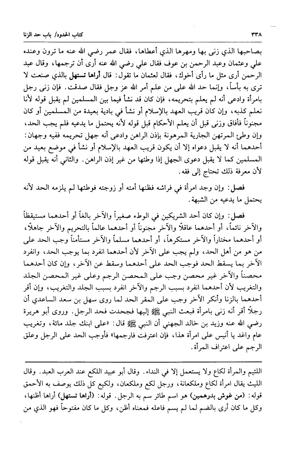 بصاحبها الذي زنى بها ومهرها الذي أعطاها فقال عمر رضي الله عنه ما ترون وعنده علي وعثمان عبد الرحمن بن عوف فقال علي رضي الله عنه أرى أن ترجمها وقال عبد الرحمن أرى مثل ما رأى أخوك فقال لعثمان ما تقول: قال أراها تستهل بالذي صنعت لا ترى به بأساً وإنما حد الله على من علم أمر الله عز وجل فقال صدقت فإن زنى رجل بامرأة وادعى أنه لم يعلم بتحريمه فإن كان نشأ فيما بين المسلمين لم يقبل قوله لأنا نعلم كذبه وإن كان قريب العهد بالإسلام أو نشأ في بادية بعيدة أو كان مجنوناً فأفاق وزنى قبل أن يعلم الأحكام قبل قوله لأنه يحتمل ما يدعيه فلم يجب الحد وإن وطئ المرتهن الجارية المرهونة بإذن الراهن وادعى أنه جهل تحريمه ففيه وجهان: أحدهما: أنه لا يقبل دعواه إلا أن يكون قريب العهد بالإسلام أو نشأ في موضع بعيد من المسلمين كما لا يقبل دعوى الجهل إذا وطئها من غير إذن الراهن والثاني: أنه يقبل قوله لأن معرفة ذلك تحتاج إلى فقه.