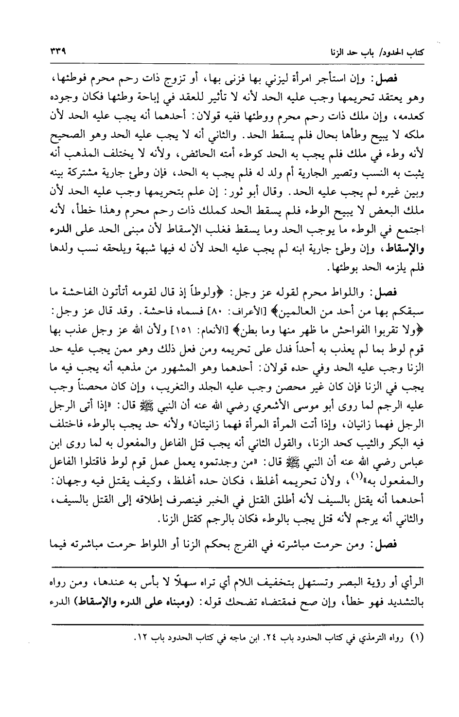 فصل: وإن استأجر امرأة ليزني بها فزنى بها أو تزوج ذات رحم فوطئها وهو يعتقد تحريمها وجب عليه الحد لأنه لا تأثير للعقد في إباحة وطئها فكان وجوده كعدمه وإن ملك ذات رحم محرم ووطئها ففيه قولان: أحدهما: أنه يجب عليه الحد لأن ملكه لا يبيح وطأها بحال فلم يسقط الحد والثاني: أنه لا يجب عليه الحد وهو الصحيح لأنه وطء في ملك فلم يجب به الحد كوطء أمته الحائض ولأنه وطئ جارية مشتركة بينه وبين غيره لم يجب عليه الحد وقال أبو ثور: إن علم بتحريمها وجب عليه الحد لأن ملك البعض لا يبيح الوطء فلم يسقط الحد كملك ذات رحم محرم وهذا خطأ لأنه اجتمع في الوطء ما يوجب الحد وما يسقط فغلب الإسقاط لأن مبنى الحد على الدرء والإسقاط وإن وطئ جارية ابنه لم يجب عليه الحد لأن له فيها شبهة ويلحقه نسب ولدها فلم يلزمه الحد بوطئها.