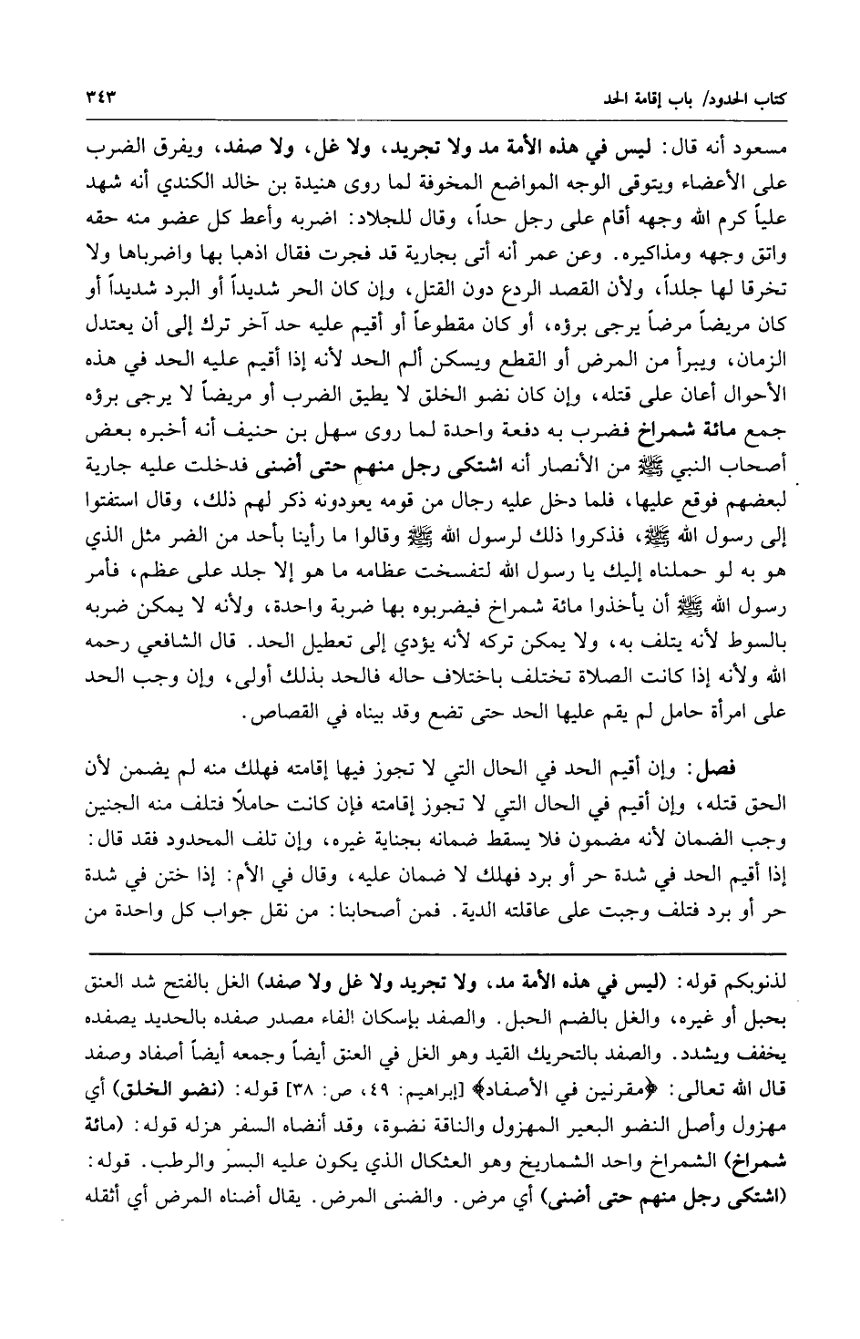 مسعود أنه قال: ليس في الأمة مد ولا تجريد ولا غل ولا صفد ويفرق الضرب على الأعضاء ويتوقى الوجه المواضع المخوفة لما روى هنيدة بن خالد الكندي أنه شهد علياً كرم الله وجهه أقام على رجل حداً وقال للجلاد: اضربه وأعط كل عضو منه حقه واتق وجهه ومذاكيره وعن عمر أنه أتى بجارية قد فجرت فقال اذهبا بها واضرباها ولا تخرقا لها جلداً ولأن القصد الردع دون القتل وإن كان الحر شديداً أو البرد شديداً أو كان مريضاً مرضاً يرجى برؤه أو كان مقطوعاً أو أقيم عليه حد آخر ترك إلى أن يعتدل الزمان ويبرأ من المرض أو القطع ويسكن ألم الحد لأنه إذا أقيم عليه الحد في هذه الأحوال أعان على قتله وإن كان نضو الخلق لا يطيق الضرب أو مريضاً لا يرجى برؤه جمع مائة شمراخ فضرب به دفعة واحدة لما روى سهل بن حنيف أنه أخبره بعض أصحاب النبي صلى الله عليه وسلم من الأنصار أنه اشتكى رجل منهم حتى أضنى فدخلت عليه جارية لبعضهم فوقع عليها فلما دخل عليه رجال من قومه يعودونه ذكر لهم ذلك وقال استفتوا إلى رسول الله صلى الله عليه وسلم فذكروا ذلك لرسول الله صلى الله عليه وسلم وقالوا ما رأينا بأحد من الضر مثل الذي هو به لو حملناه إليك يا رسول الله لتفسخت عظامه ما هو إلا جلد على عظم فأمر رسول الله صلى الله عليه وسلم أن يأخذوا مائة شمراخ فيضربوه بها ضربة واحدة ولأنه لا يمكن ضربه بالسوط لأنه يتلف به ولا يمكن تركه لأنه يؤدي إلى تعطيل الحد قال الشافعي رحمه الله: ولأنه إذا كانت الصلاة تختلف باختلاف حاله فالحد بذلك أولى وإن وجب الحد على امرأة حامل لم يقم عليها الحد حتى تضع وقد بيناه في القصاص.