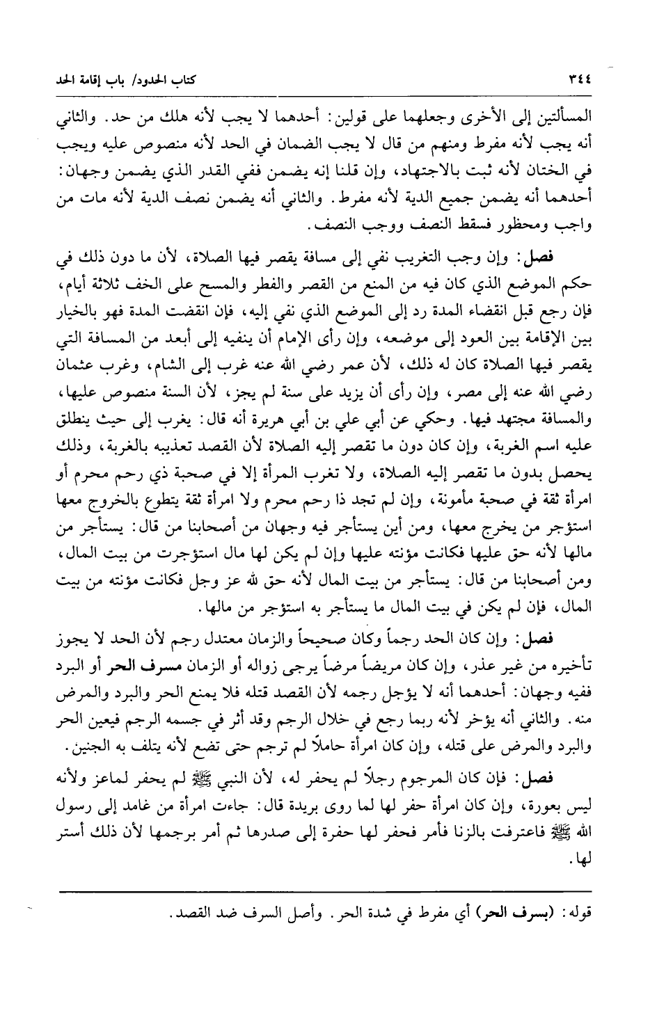 فصل: وإن وجب التغريب نفي إلى مسافة يقصر فيها الصلاة لأن ما دون ذلك في حكم الموضع الذي كان فيه من المنع من القصر والفطر والمسح على الخف ثلاثة أيام فإن رجع قبل انقضاء المدة رد إلى الموضع الذي نفي إليه فإن انقضت المدة فهو بالخيار بين الإقامة وبين العودة إلى موضعه وإن رأى الإمام أن ينفيه الى أبعد من المسافة التي يقصر فيها الصلاة كان له ذلك لأن عمر رضي الله عنه غرب إلى الشام وغرب عثمان رضي الله عنه الى مصر وإن رأى أن يزيد على سنة لم يجز لأن السنة منصوص عليها والمسافة مجتهد فيها وحكي عن أبي علي بن أبي هريرة أنه قال: يغرب الى حيث ينطلق عليه اسم الغربة وإن كان دون ما تقصر إليه الصلاة لأن القصد تعذيبه بالغربة وذلك يحصل بدون ما تقصر إليه الصلاة ولا تغرب المرأة إلا في صحبة ذي رحم محرم أو امرأة ثقة في صحبة مأمونة وإن لم تجد ذا رحم محرم ولا امرأة ثقة يتطوع بالخروج معها استؤجر من يخرج معها ومن أين يستأجر فيه وجهان من أصحابنا من قال: يستأجر من مالها لأنه حق عليها فكانت مؤنته عليها وإن لم يكن لها مال استؤجرت من بيت المال ومن أصحابنا من قال: يستأجر من بيت المال لأنه حق لله عز وجل فكانت مؤنته من بيت المال فإن لم يكن في بيت المال ما يستأجر به استؤجر من مالها.