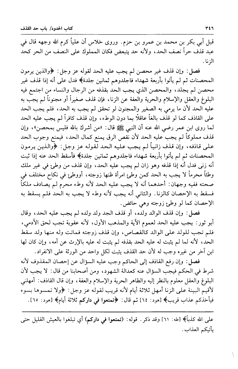فصل: وان قذف الوالد ولده أو قذف الجد ولد ولده لم يجب عليه الحد وقال أبو ثور: يجب عليه الحد لعموم الآية والمذهب الأول لأنه عقوبة تجب لحق الآدمي فلم تجب للولد على الوالد كالقصاص وإن قذف زوجته فماتت وله منها ولد سقط الحد لأنه لما لم يثبت له عليه الحد بقذفه لم يثبت له عليه بالإرث عن أمه وإن كان لها ابن آخر من غيره وجب له لأن حد القذف يثبت لكل واحد من الورثة على الانفراد.