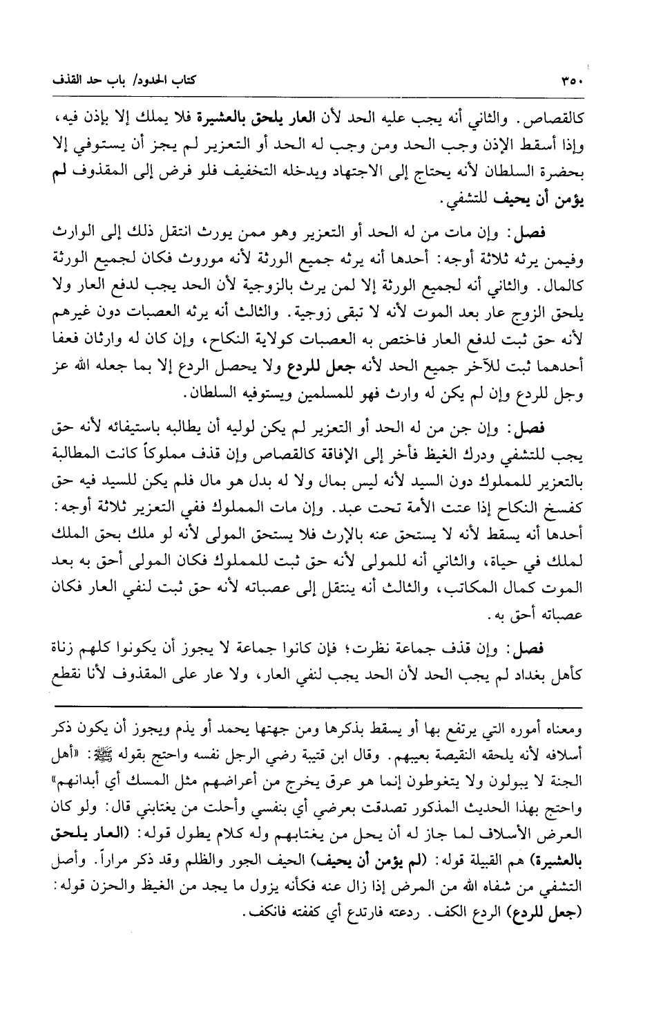 فصل: وإن جن من له الحد او التعزير لم يكن لوليه أن يطالبه باستيفائه لأنه حق يجب للتشفي ودرك الغيظ فأخر الى الإفاقة كالقصاص وإن قذف مملوكاً كانت المطالبة بالتعزير للمملوك دون السيد لأنه ليس بمال ولا له بدل هو مال فلم يكن للسيد فيه حق كفسخ النكاح إذا عتت الأمة تحت عبد وغن مات المملوك ففي التعزير ثلاثة أوجه: أحدها أنه يسقط لأنه لا يستحق عنه بالإرث فلا يستحق المولى لانه لو ملك بحق الملك لملك في حياة والثاني: أنه للمولى لأنه حق ثبت للمملوك فكان المولى احق به بعد الموت كمال المكاتب والثالث أنه ينتقل الى عصباته لانه حق ثبت لنفي العار فكان عصباته احق به.