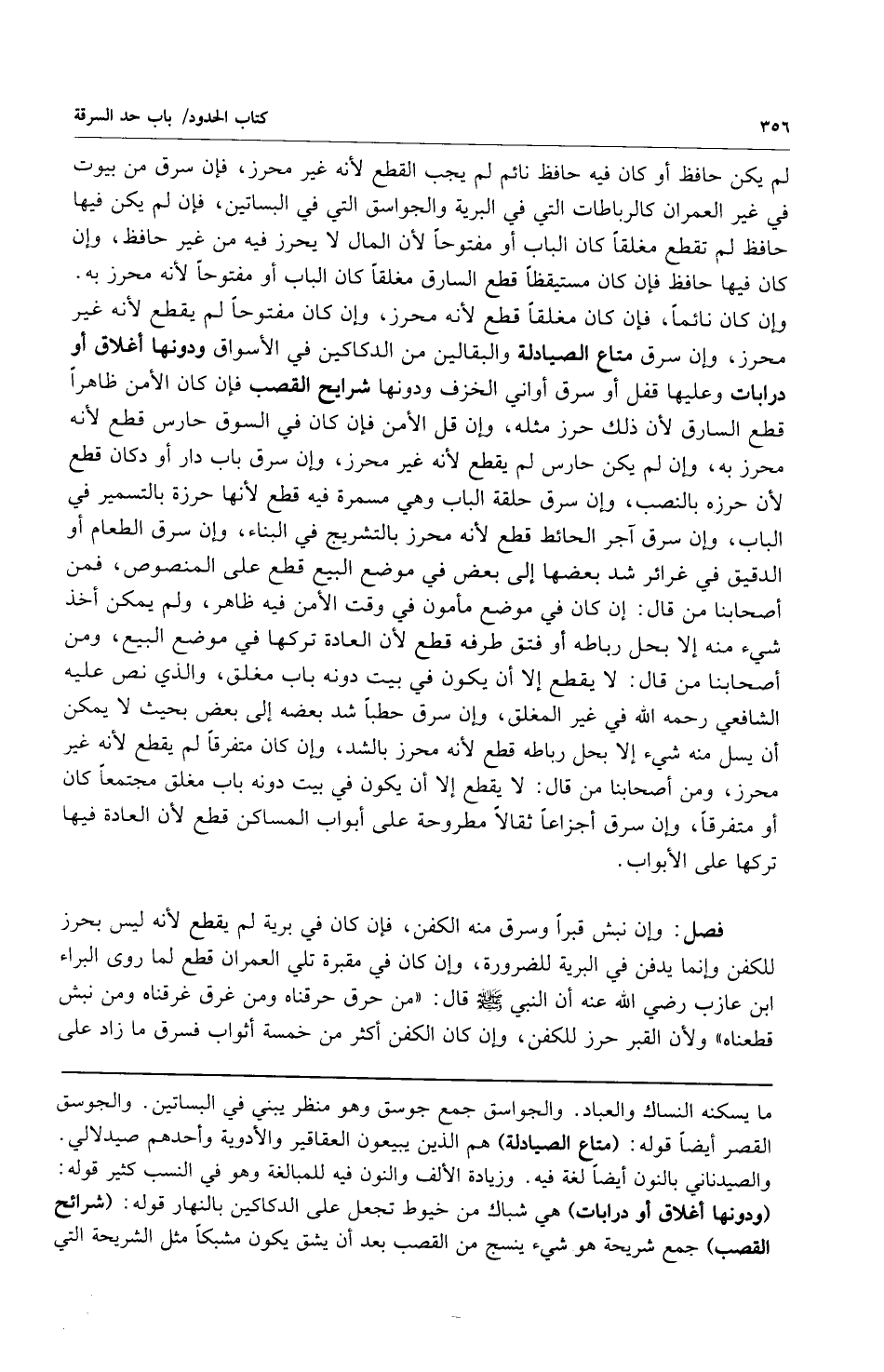 لم يكن حافظ أو كان فيه حافظ نائم لم يجب القطع لأنه غير محرز فإن سرق من بيوت في غير العمران كالرباطات التي في البرية والجواسق التي في البساتين فإن لم يكن فيها حافظ لم تقطع مغلقاً كان الباب أو مفتوحاً لأن المال لا يحرز فيه من غير حافظ وإن كان فيها حافظ فإن كان مستيقظاً قطع السارق مغلقاً كان الباب أو مفتوحاً لأنه محرز به وإن كان نائماً فإن كان مغلقاً قطع لأنه محرز وإن كان مفتوحاً لم يقطع لأنه غير محرز وإن سرق متاع الصيادلة والبقالين من الدكاكين في الأسواق ودونها أغلاق أو درابات وعليها قفل أو سرق أواني الخزف ودونها شرايح القصب فإن كان الأمن ظاهراً قطع السارق لأن ذلك حرز مثله وإن قل الأمن فإن كان في السوق حارس قطع لأنه محرز به وإن لم يكن حارس لم يقطع لأنه غير محرز وإن سرق باب دار أو دكان قطع لأن حرزه بالنصب وإن سرق حلقة الباب وهي مسمرة فيه قطع لأنها حرزة بالتسمير في الباب وإن سرق آجر الحائط قطع لأنه محرز بالتشريج في البناء وإن سرق الطعام أو الدقيق في غرائر شد بعضها إلى بعض في موضع البيع قطع على المنصوص فمن أصحابنا من قال: إن كان في موضع مأمون في وقت الأمن فيه ظاهر ولم يمكن أخذ شيء منه إلا بحل رباطه أو فتق طرفه قطع لأن العادة تركها في موضع البيع ومن أصحابنا من قال: لا يقطع إلا أن يكون في بيت دونه باب مغلق والذي نص عليه الشافعي رحمه الله في غير المغلق وإن سرق حطباً شد بعضه إلى بعض بحيث لا يمكن أن يسل منه شيء إلا بحل رباطه قطع لأنه محرز بالشد وإن كان متفرقاً لم يقطع لأنه غير محرز ومن أصحابنا من قال: لا يقطع إلا أن يكون في بيت دنه باب مغلق مجتمعاً كان أو متفرقاً وإن سرق أجزاعاً ثقالاً مطروحة على أبواب المساكن قطع لأن العادة فيها تركها على الأبواب.