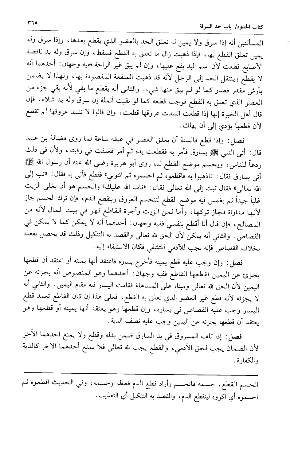فصل: وإذا قطع فالسنة أن يعلق العضو في عنقه ساعة لما روى فضالة بن عبيد قال: أتى النبي صلى الله عليه وسلم بسارق فأمر به فقطعت يده ثم أمر فعلقت في رقبته ولأن في ذلك ردعاً للناس ويحسم موضع القطع لما روى أبو هريرة رضي الله عنه أن رسول الله صلى الله عليه وسلم أتى بسارق فقال: "اذهبوا به فاقطعوه ثم احسموه ثم ائتوني" فقطع فأتى به فقال: "تب إلى الله تعالى" فقال تبت إلى الله تعالى فقال: "تاب الله عليك" والحسم هو أن يغلي الزيت غلياً جيداً ثم يغمس فيه موضع القطع لتنحسم العروق وينقطع الدم فإن ترك الحسم جاز لأنها مداواة فجاز تركها وأما ثمن الزيت وأجرة القاطع فهو في بيت المال لأنه من المصالح فإن قال أنا أقطع بنفسي ففيه وجهان: أحدهما: أنه لا يمكن كما في القصاص والثاني: أنه يمكن لأن الحق لله تعالى والقصد به التنكيل وذلك قد يحصل بفعله بخلاف القصاص فإنه يجب للآدمي للتشفي فكان الاستيفاء إليه.