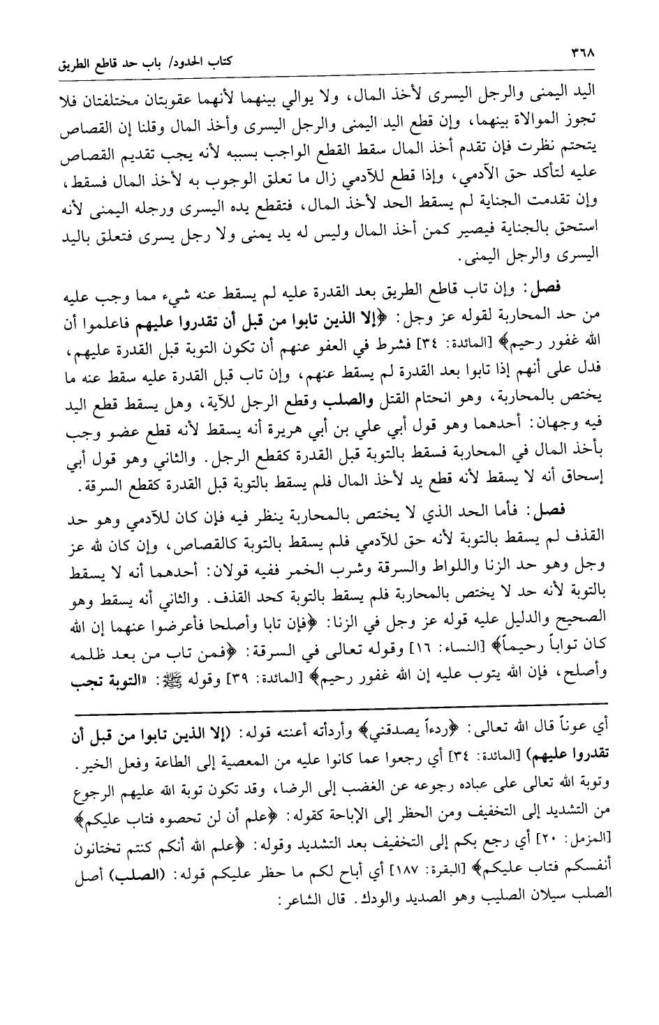 فصل: فأما الحد الذي لا يختص بالمحاربة ينظر فيه فإن كان للآدمي وهو حد القذف لم يسقط بالتوبة لأنه حق للآدمي فلم يسقط بالتوبة كالقصاص وإن كان لله عز وجل وهو حد الزنا واللواط والسرقة وشرب الخمر ففيه قولان: أحدهما: أنه لا يسقط بالتوبة لأنه حد لا يختص بالمحاربة فلم يسقط بالتوبة كحد القذف والثاني: أنه يسقط وهو الصحيح والدليل علي قوله عز وجل في الزنا: {فَإِنْ تَابَا وَأَصْلَحَا فَأَعْرِضُوا عَنْهُمَا إِنَّ الله كَانَ تَوَّاباً رَحِيماً} [النساء: 16] وقوله تعالى في السرقة: {فَمَنْ تَابَ مِنْ بَعْدِ ظُلْمِهِ وَأَصْلَحَ فَإِنَّ الله يَتُوبُ عَلَيْهِ إِنَّ الله غَفُورٌ رَحِيمٌ} [المائدة: 39] وقوله صلى الله عليه وسلم: "التوبة تجب