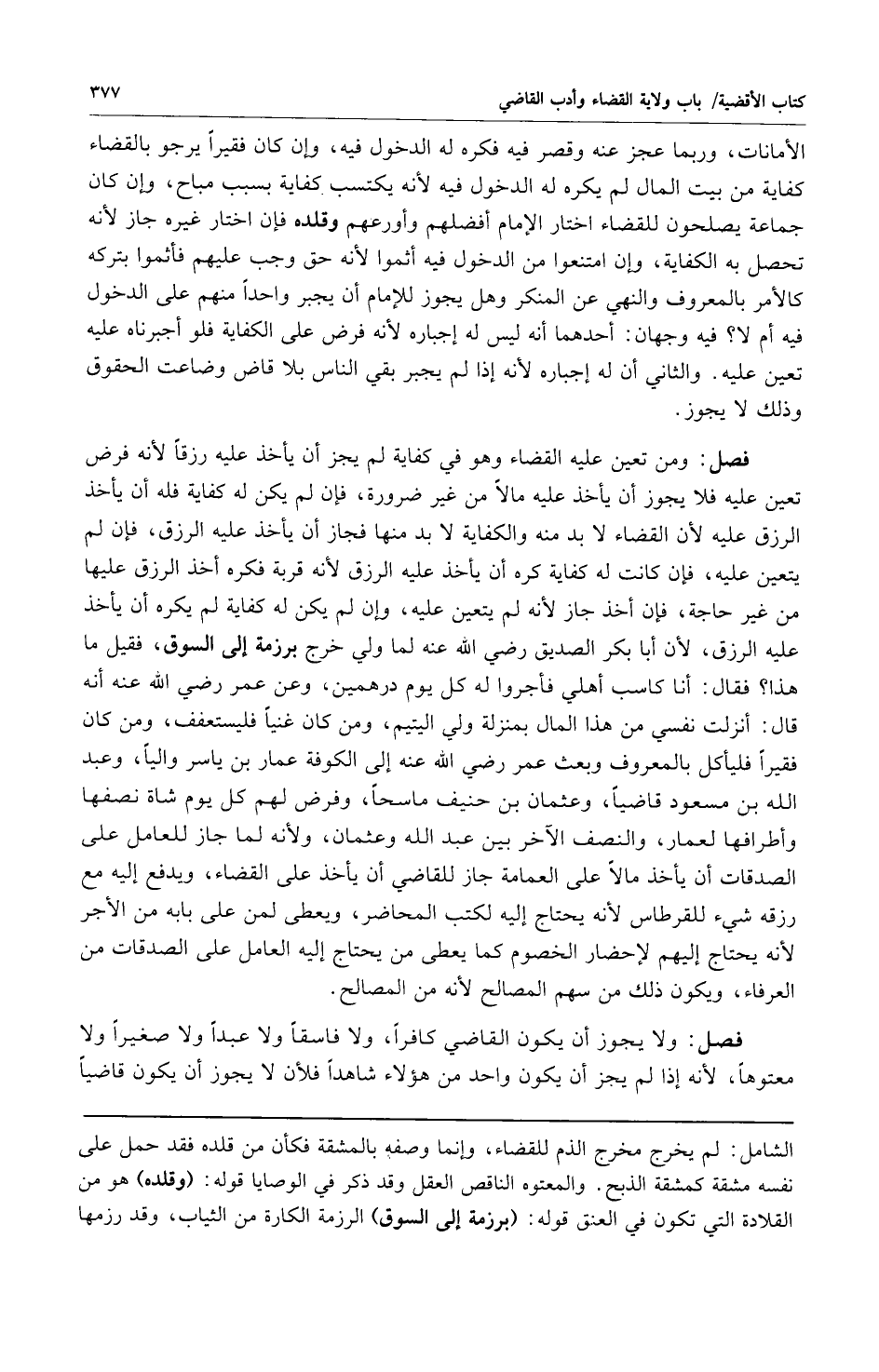 فصل: ومن تعين عليه القضاء وهو في كفاية لم يجز أن يأخذ عليه رزقاً لأنه فرض تغين عليه فلا يجوز أن يأخذ عليه مالاً من غير ضرورة فإن لم يكن له كفاية فله أن يأخذ الرزق عليه لأن القضاء لا بد منه والكفاية لا بد منها فجاز أن يأخذ عليه الرزق فإن لم يتعين عليه فإن كانت له كفاية كره أن يأخذ عليه الرزق لأنه قربة فكره أخذ الرزق عليها من غير حاجة فإن أخذ جاز لأنه لم يتعين عليه وإن لم يكن له كفاية لم يكره أن يأخذ عليه الرزق لأن أبا بكر الصديق رضي الله عنه لما ولي خرج برزمة إلى السوق فقيل ما هذا؟ فقال: أنا كاسب أهلي فأجروا له كل يوم درهمين وعن عمر رضي الله عنه أنه قال: أنزلت نفسي من هذا المال بمنزلة ولي اليتيم ومن كان غيناً فليستعفف ومن كان فقيراً فليأكل بالمعروف وبعث عمر رضي الله عنه إلى الكوفة عمار بن ياسر والياً وعبد الله بن مسعود قاضياً وعثمان بن حنيف ماسحاً وفرض لهم كل يوم شاة نصفها وأطرافها لعمار والنصف الآخر بين عبد الله وعثمان ولأنه لما جاز للعامل على الصدقات أن يأخذ مالاً على العمامة جاز للقاضي أن يأخذ على القضاء ويدفع إليه مع رزقه شيء للقرطاس لأنه يحتاج إليه لكتب المحاضر ويعطى لمن على بابه من الأجر لأنه يحتاج إليهم لإحضار الخصوم كما يعطى من يحتاج إليه العامل على الصدقات من العرفاء ويكون ذلك من سهم المصالح لأنه من المصالح.
