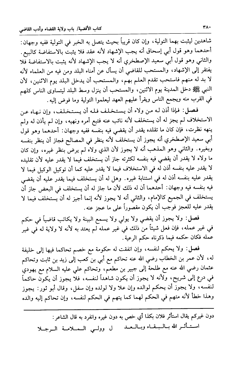 فصل: فإذا أذن له من ولاء أن يستخلف فله أن يستخلف وإن نهاه عن الاستخلاف لم يجز له أن يستخلف لأنه نائب عنه فتبع أمره ونهيه وإن لم يأذن له ولم ينهه نظرت فإن كان ما تقلده يقدر أن يقضي فيه بنفسه ففيه وجهان: أحدهما: وهو قول أبي سعيد الاصطخري أنه يجوز أن يستخلف لأنه ينظر في المصالح فجاز أن ينظر بنفسه وبغيره والثاني: وهو المذهب أنه لا يجوز لأن الذي ولاه لم يرض بنظر غيره وإن كان ما ولاه لا يقدر أن يقضي فيه بنفسه لكثرته جاز أن يستخلف فيما لا يقدر عليه لأن تقليده لا يقدر عليه بنفسه أذن في الاستخلاف فيما لا يقدر عليه كما أن توكيل الوكيل فيما لا يقدر عليه بنفسه أذن له في استنابة غيره وهل له أن يستخلف فيما يقدر عليه أن يقضي فيه بنفسه فيه وجهان: أحدهما: أن له ذلك لأن ما جاز له أن يستخلف في البعض جاز أن يستخلف في الجميع كالإمام والثاني: أنه لا يجوز لأنه إنما أجيز له أن يستخلف فيما لا يقدر علي للعجز فوجب أن يكون مقصوراً على ما عجز عنه.