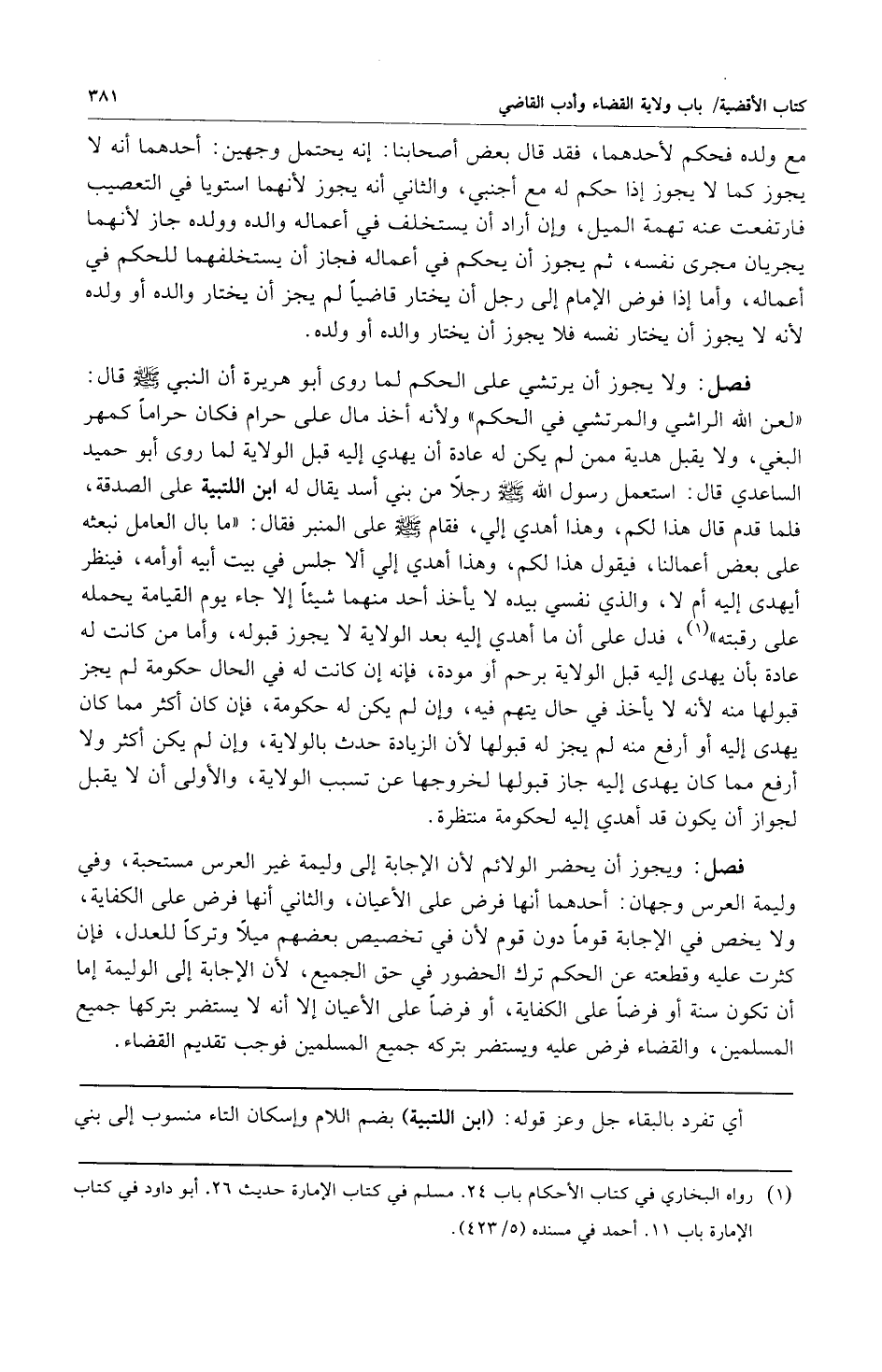 فصل: ولا يجوز أن يرتشي على الحكم لما روى أبو هريرة أن النبي صلى الله عليه وسلم قال: "لعن الله الراشي والمرتشي في الحكم". ولأنه أخذ مال على حرام فكان حراماً كمهر البغي ولا يقبل هدية ممن لم يكن له عادة أن يهدي إليه قبل الولاية لما روى أبو حميد الساعدي قال: استعمل رسول الله صلى الله عليه وسلم رجلاً من بني أسد يقال له ابن اللتبية على الصدقة فلما قدم قال هذا لكم وهذا أهدي إلي فقام صلى الله عليه وسلم على المنبر فقال: "ما بال العامل نبعثه على بعض أعمالنا فيقول هذا لكم وهذا أهدي إلي ألا جلس في بيت أبيه أو أمه فينظر أيهدى إليه أم لا والذي نفسي بيده لا يأخذ أحد منهما شيئاً إلا جاء يوم القيامة يحمله على رقبته" 1. فدل على أن ما أهدي إليه بعد الولاية لا يجوز قبوله وأما من كانت له عادة بأن يهدى إليه قبل الولاية برحم أو مودة فإنه إن كانت له في الحال حكومة لم يجز قبولها منه لأنه لا يأخذ في حال يتهم فيه وإن لم يكن له حكومة فإن كان أكثر مما كان يهدى إليه أو أرفع منه لم يجز له قبولها لأن الزيادة حدث بالولاية وإن لم يكن أكثر ولا أرفع مما كان يهد إليه جاز قبولها لخروجها عن تسبب الولاية والأولى أن لا يقبل لجواز أن يكون قد أهدي إليه لحكومة منتظرة.
