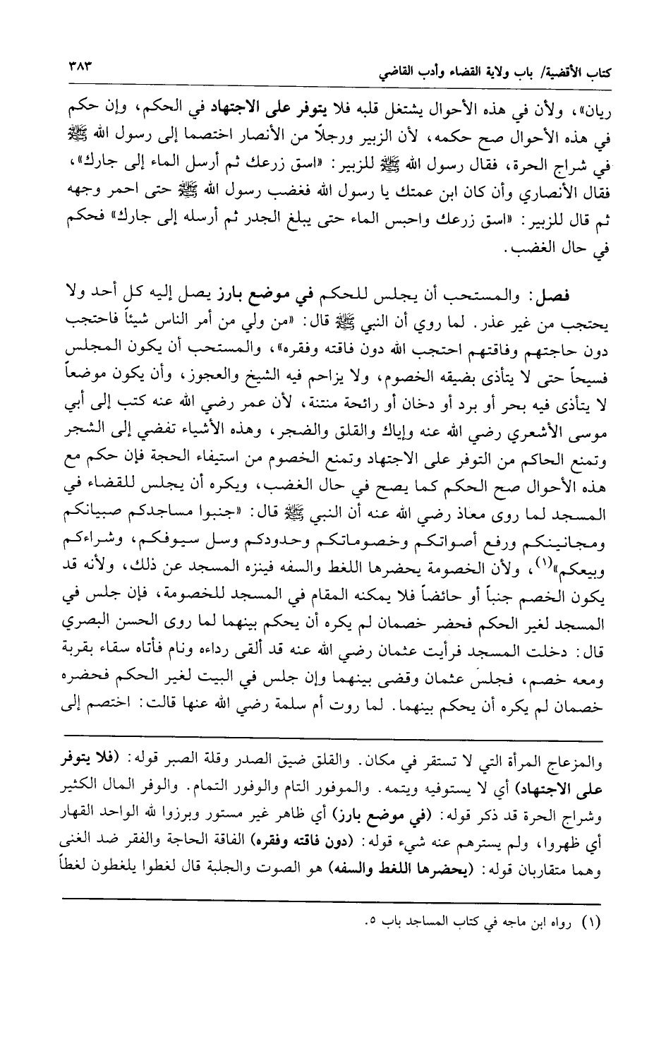 فصل: والمستحب أن يجلس للحكم في موضع بارز يصل إليه كل أحد ولا يحتجب من غير عذر لما روي أن النبي صلى الله عليه وسلم قال: "من ولي من أمر الناس شيئاً فاحتجب دون حاجتهم وفاقتهم احتجب الله دون فاقته وفقره". والمستحب أن يكون المجلس فيسحاً حتى لا يتأذى بضيقه الخصوم ولا يزاحم فيه الشيخ والعجوز وأن يكون موضعاً لا يتأذى فيه بحر أو برد أو دخان أو رائحة منتنة لأن عمر رضي الله عنه كتب إلى أبي موسى الأشعري رضي الله عنه وإياك والقلق والضجر وهذه الأشياء تفضي إلى الشجر وتمنع الحاكم من التوفر على الاجتهاد وتمنع الخصوم من استيفاء الحجة فإن حكم مع هذه الأحوال صح الحكم كما يصح في حال الغضب ويكره أن يجلس للقضاء في المسجد لما روى معاذ رضي الله عنه أن النبي صلى الله عليه وسلم قال: "جنبوا مساجدكم صبيانكم ومجانينكم ورفع أصواتكم وخصوماتكم وحدودكم وسل سيوفكم وشراءكم وبيعكم" 1. ولأن الخصومة يحضرها اللغط والسفه فينزه المسجد عن ذلك ولأنه قد يكون الخصم جنباً أو حائضاً فلا يمكنه المقام في المسجد للخصومة فإن جلس في المسجد لغير الحكم فحضر خصمان لم يكره أن يحكم بينهما لما روى الحسن البصري قال: دخلت المسجد فرأيت عثمان رضي الله عنه قد ألقى رداءه ونام فأتاه سقاء بقربة ومعه خصم فجلس عثمان وقضى بينهما وإن جلس في البيت لغير الكم فحضره خصمان لم يكره أن يحم بينهما لما روت أم سلمة رضي الله عنها قالت: اختصم إلى