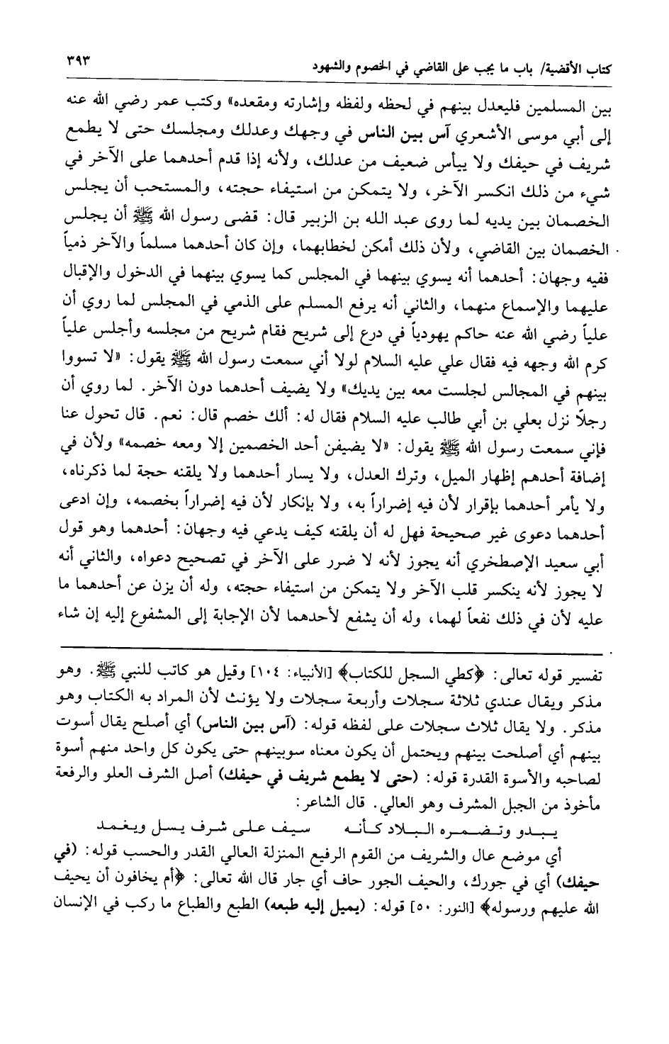 بين المسلمين فليعدل بينهم في لحظه ولفظه وإشارته ومقعده" وكتب عمر رضي الله عنه إلى أبي موسى الأشعري آس بين الناس في وجهك وعدلك ومجلسك حتى لا يطمع شريف في حيفك ولا ييأس ضعيف من عدلك ولأنه إذا قدم أحدهما: على الآخر في شيء من ذلك انكسر الآخر ولا يتمكن من استيفاء حجته والمستحب أن يجلس الخصمان بين يديه لما روى عبد الله بن الزبير قال: قضى رسول الله صلى الله عليه وسلم أن يجلس الخصمان بين القاضي ولأن ذلك أمكن لخطابهما وإن كان أحدهما: مسلماً والآخر ذمياً ففيه وجهان: أحدهما: أنه يسوي بينهما في المجلس كما يسوي بينهما في الدخول والإقبال عليهما والإسماع منهما والثاني: أنه يرفع المسلم على الذمي في المجلس وأجلس علياً كرم الله وجهه فيه فقال علي كرم الله وجهه لولا أني سمعت رسول الله صلى الله عليه وسلم يقول: "لا تسووا بينهم في المجالس" لجلست معه بين يديك ولا يضيف أحدهما: دون الآخر لما روي أن رجلاً نزل بعلي بن أبي طالب كرم الله وجهه فقال له: ألك خصم قال: نعم قال تحول عنا فإني سمعت رسول الله صلى الله عليه وسلم يقول: "لا يضيفن أحد الخصمين إلا ومعه خصمه" ولأن في إضافة أحدهم إظهار الميل وترك العدل ولا يسار أحدهما: ولا يلقنه حجة لما ذكرناه ولا يأمر أحدهما: بإقرار لأن فيه إضراراً به ولا بإنكار لأن فيه إضراراً بخصمه وإن ادعى أحدهما: دعوى غير صحيحة فهل له أن يلقنه كيف يدعي فيه وجهان: أحدهما: وهو قول أبي سعيد الإصطخري أنه يجوز لأنه لا ضرر على الآخر في تصحيح دعواه والثاني: أنه لا يجوز لأنه ينكسر قلب الآخر ولا يتمكن من استيفاء حجته وله أن يزن عن أحدهما: ما عليه لأن في ذلك نفعاً لهما وله أن يشفع لأحدهما: لأن الإجابة إلى المشفوع إليه إن شاء