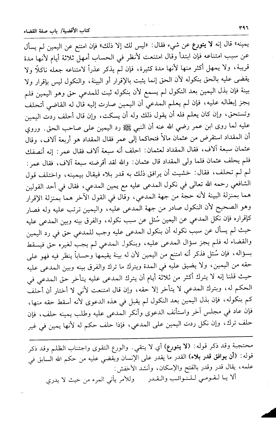يمينه" قال إنه لا يتورع عن شيء فقال: "ليس له إلا ذلك" فإن امتنع عن اليمين لم يسأل عن سبب امتناعه فإن ابتدأ وقال امتنعت لأنظر في الحساب أمهل ثلاثة أيام لأنها مدة قريبة ولا يمهل أكثر منها لأنها مدة كثيرة فإن لم يذكر عذراً لامتناعه جعله ناكلاً ولا يقضى عليه بالحق بنكوله لأن الحق إنما يثبت بالإقرار أو البينة والنكول ليس بإقرار ولا بينة فإن بذلك اليمين بعد النكول لم يسمع لأن بنكوله ثبت للمدعي حق وهو اليمين فلم يجز إبطاله عليه فإن لم يعلم المدعي أن اليمين صارت إليه قال له القاضي أتحلف وتستحق وإن كان يعمل فله أن يقول ذلك وله أن يسكت وإن قال أحلف ردت اليمين عليه لما روى ابن عمر رضي الله عنه أن النبي صلى الله عليه وسلم رد اليمين على صاحب الحق وروي أن المقداد استقرض من عثمان مالاً فتحاكما إلى عمر فقال المقداد هو أربعة آلاف وقال عثمان سبعة آلاف فقال المقداد لعثمان: احلف أنه سبعة آلاف فقال عمر: إنه أنصفك فلم يحلف عثمان فلما ولى المقداد قال عثمان: والله لقد أقرضته سبعة آلاف فقال عمر: لم لم تحلف فقال: خشيت أن يرافق ذلك به قدر بلاء فيقال بيمينه واختلف قول الشافعي رحمه الله تعالى في نكول المدعي عليه مع يمين المدعي فقال في أحد القولين هما بمنزلة البينة لأنه حجة من جهة المدعي وقال في القول الآخر هما بمنزلة الإقرار وهو الصحيح لأن النكول صادر من جهة المدعى عليه واليمين ترتب عليه وله فصار كإقراره فإن نكل المدعي عن اليمين سئل عن سبب نكوله والفرق بينه وبين المدعى عليه حيث لم يسأل عن سبب نكوله أن بنكول المدعى عليه وجب للمدعي حق في رد اليمين والقضاء له فلم يجز سؤال المدعى عليه وبنكول المدعي لم يجب لغيره حق فيسقط بسؤاله فإن سئل فذكر أنه امتنع من اليمين لأن له بينة يقيمها وحساباً ينظر فيه فهو على حقه من اليمين ولا يضيق عليه في المدة ويترك ما ترك المدعى عليه يتأخر حق المدعي في الحكم له وبترك المدعي لا يتأخر إلا حقه وإن قال امتنعت لأني لا أختار أن أحلف كم بنكوله فإن بذل اليمين بعد النكول لم يقبل في هذه الدعوى لأنه أسقط حقه منها فإن عاد في مجلس آخر واستأنف الدعوى وأنكر المدعى عليه وطلب يمينه حلف فإن حلف ترك وإن نكل ردت اليمين على المدعي فإذا حلف حكم له لأنها يمين في غير
