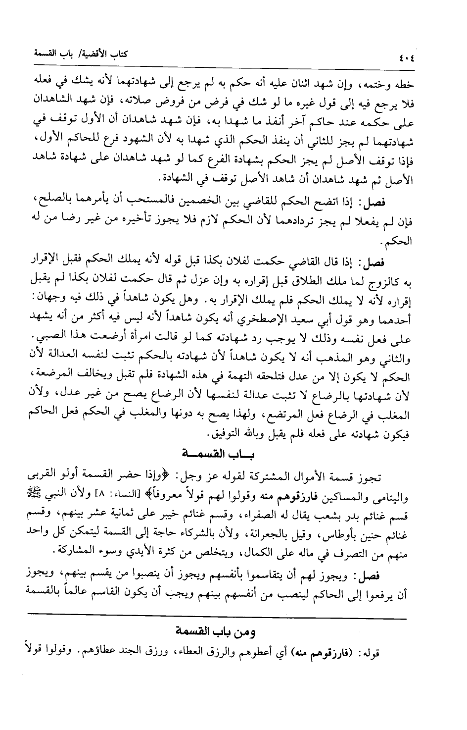 تجوز قسمة الأموال المشتركة لقوله عز وجل: {وَإذا حَضَرَ الْقِسْمَةَ أُولُو الْقُرْبَى وَالْيَتَامَى وَالْمَسَاكِينُ فَارْزُقُوهُمْ مِنْهُ وَقُولُوا لَهُمْ قَوْلاً مَعْرُوفاً} [النساء: 8] ولأن النبي صلى الله عليه وسلم قسم غنائم بدر بشعب يقال له الصفراء وقسم غنائم خيبر على ثمانية عشر بينهم وقسم غنائم حنين بأوطاس وقيل بالجعرانة ولأن الشرطاء حاجة إلى القسمة ليتمكن كل واحد منهم من التصرف في ماله على الكمال ويتخلص من كثرة الأيدي وسوء المشاركة.
