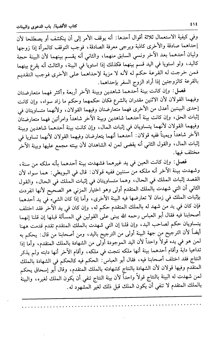 فصل: وإن كانت العين في يد غيرهما فشهد بينة أحدهما: بأنه ملكه من سنة وشهدت بينة الآخر أنه ملكه من سنتين ففيه قولان: قال في البويطي: هما سواء لأن القصد إثبات الملك في الحال وعما متساويتان في إثبات الملك في الحال والقول الثاني أن التي شهدت بالملك المتقدم أولى وهو اختيار المزني هو الصحيح لأنها انفردت بإثبات الملك في زمان لا تعارضها فيه البينة الأخرى وأما إذا كان الشيء في يد أحدهما: فإن كان في يد من شهد له بالملك المتقدم حكم له وإن كان في يد الآخر فقد اختلف أصحابنا فيه فقال أبو العباس رحمه الله يبنى على القولين في المسألة قبلها إن قلنا إنهما يتساويان حكم لصاحب اليد وإن قلنا إن التي شهدت بالملك المتقدم تقدم قدمت ههنا أيضاً لأن الترجيح من جهة البينة أولى من الترجيح باليد ومن أصحابنا من قال: يحكم به لمن هو في يده قولاً واحداً لأن اليد الموجودة أولى من الشهادة بالملك المتقدم وأما إذا تداعيا دابة وأقام أحدهما: بينة أنها ملكه نتجت في ملكه وأقام الآخر أنها دابته ولم يذكر المتقدم وفيها قولان لأن الشهادة بالنتاج كشهادته بالملك المتقدم وقال أبو إسحاق يحكم لمن شهدت له البينة بالنتاج قولاً واحداً لأن بينة النتاج تنفي أن يكون الملك لغيره والبينة بالملك المتقدم لا تنفي أن يكون الملك قبل ذلك لغير المشهود له.
