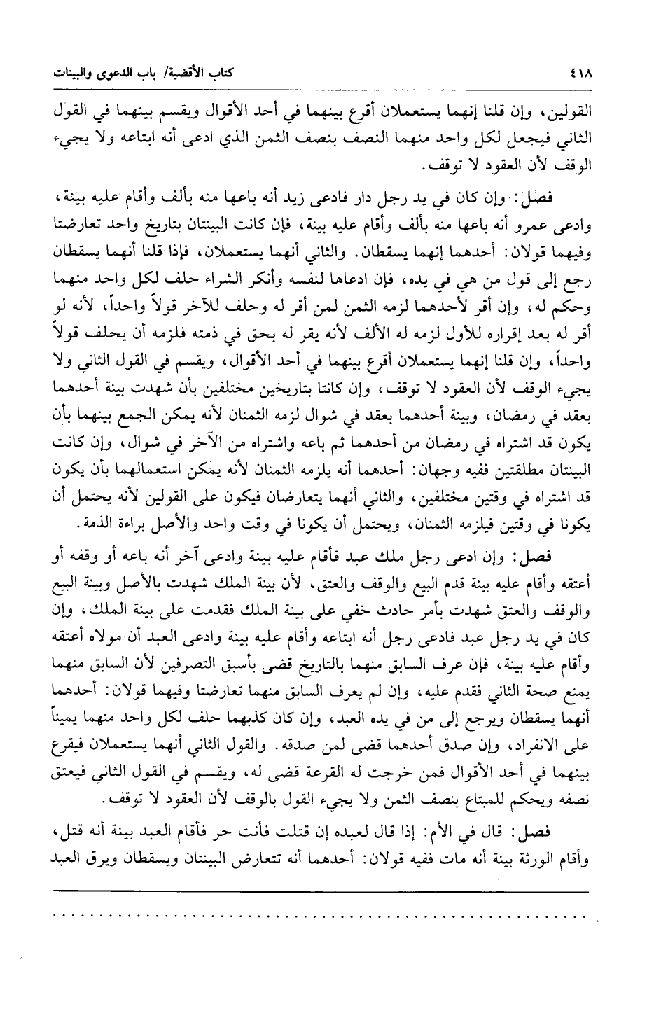 فصل: وإن كان في يد رجل دار فادعى زيد أنه باعها منه بألف وأقام عليه بينة وادعى عمرو أنه باعها منه بألف وأقام عليه بينة فإن كانت البينتان بتاريخ واحد تعارضتا وفيهما قولان: أحدهما: إنهما يسقطان والثاني: أنهما يستعملان فإذا قلنا أنهما يسقطان رجع إلى قول من هي في يده فإن ادعاها لنفسه وأنكر الشراء حلف لكل واحد منهما وحكم له وإن أقر لأحدهما: لزمه الثمن لمن أقر له وحلف للآخر قولاً واحداً لأنه لو أقر له بعد إقراره للأول لزمه له الألف لأنه يقر له بحق في ذمته فلزمه أن يحلف قولاً واحداً وإن قلنا إنهما يستعملان أقرع بينهما في أحد الأقوال ويقسم في القول الثاني ولا يجيء الوقف لأن العقود لا توقف وإن كانتا بتاريخين مختلفين بأن شهدت بينة أحدهما: بعقد في رمضان وبينة أحدهما: في شوال لزمه الثمنان لأنه يمكن الجمع بينهما بأن يكون قد اشتراه في رمضان من أحدهما: ثم باعه واشتراه من الآخر في شوال وإن كانت البينتان مطلقتين ففيه وجهان: أحدهما: أنه يلزمه الثمنان لأنه يمكن استعمالهما بأن يكون قد اشتراه في وقتين مختلفين والثاني: أنهما يتعارضان فيكون على القولين لأنه يحتمل أن يكونا في وقتين فيلزمه الثمنان ويحتمل أن يكونا في وقت واحد والأصل براءة الذمة.