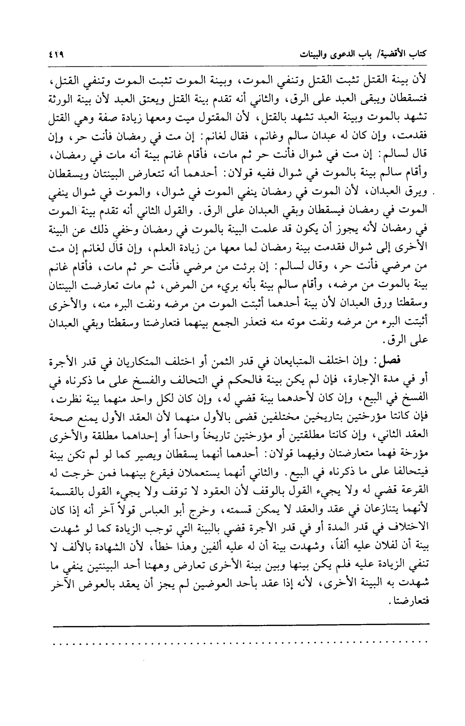 فصل: وإن اختلف المتبايعان في قدر الثمن أو اختلف المتكاريان في قدر الأجرة أوفي مدة الإجارة فإن لم يكن بينة فالحكم في التحالف والفسخ على ما ذكرناه في الفسخ في البيع وإن كان لأحدهما: بينة قضي له وإن كان لكل واحد منهما يبنة نظرت فإن كانتا مؤرختين بتاريخين مختلفين قضى بالأول منهما لأن العقد الأول يمنع صحة العقد الثاني وإن كانتا مطلقتين أو مؤرختين تاريخاً واحداً أو إحداهما مطلقة والأخرى مؤرخة فهما متعارضتان وفيهما قولان: أحدهما: أنهما يستعملان فيقرع بينهما فمن خرجت له القرعة قضي له ولا يجيء القول بالوقف لأن العقود لا توقف ولا يجيء القول بالقسمة لأنهما يتنازعان في عقد والعقد لا يمكن قسمته وخرج أبو العباس قولاً آخر أنه إذا كان الاختلاف في قدر المدة أوفي قدر الأجرة قضي بالبينة التي توجب الزيادة كما لو شهدت بينة أن لفلان عليه ألفاً وشهدت بينة أن له عليه ألفين وهذا خطأ لأن الشهادة بالألف لا تنفي الزيادة عليه فلم يكن بينها وبين بينة الأخرى تعارض وههنا أحد البينتين ينفي ما شهدت به البينة الأخرى لأنه إذا عقد بأحد العوضين لم يجز أن يعقد بالعوض الآخر فتعارضتا.