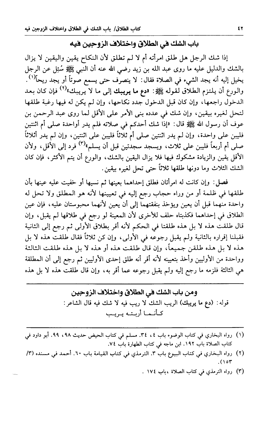 1 رواه البخاري في كتاب الوضوء باب 4، 34. مسلم في كتاب الحيض حديث 98، 99. أبو داود في كتاب الصلاة باب 192. ابن ماجه في كتاب الطهارة باب 74.