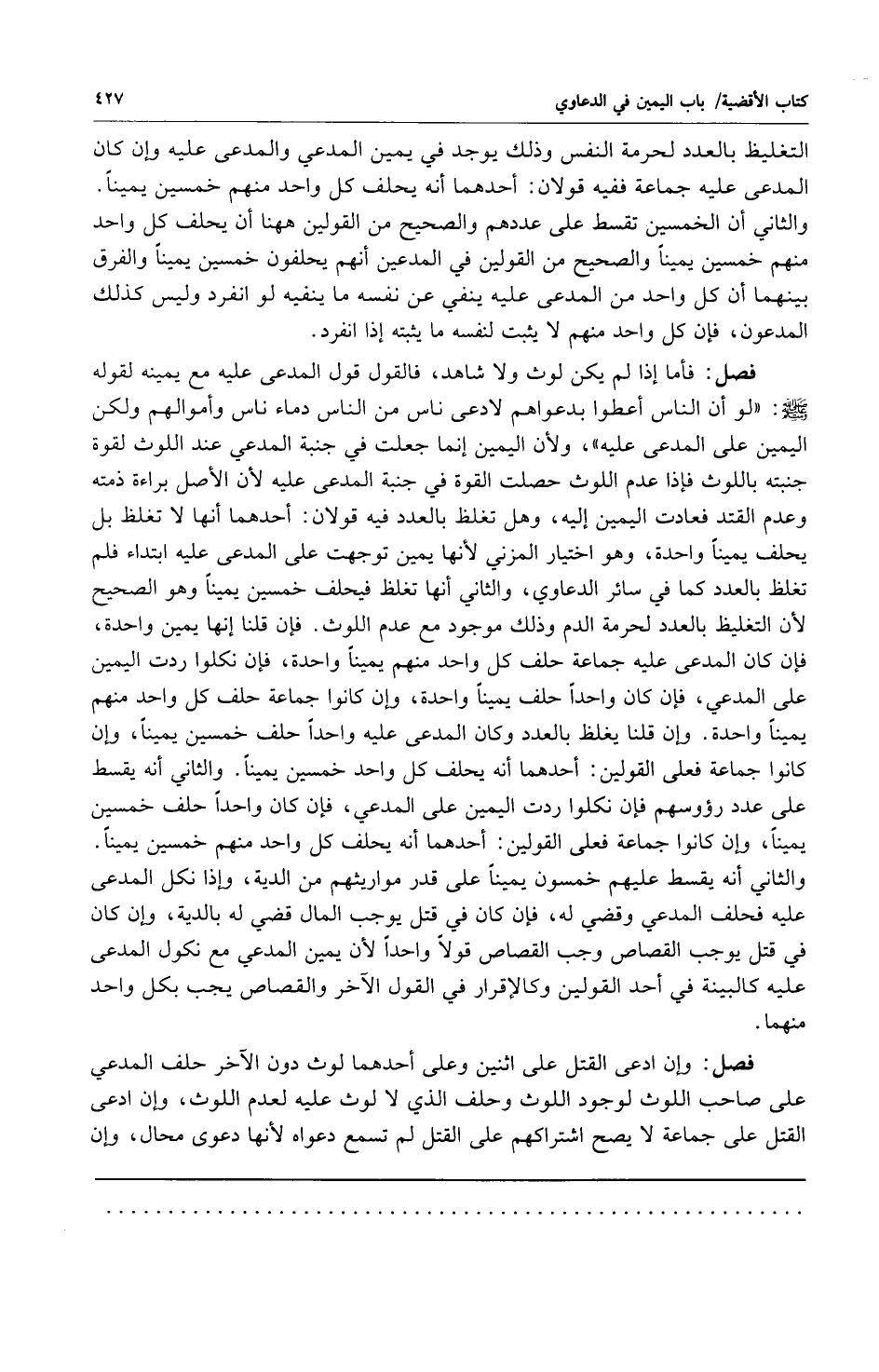 فصل: فأما إذا لم يكن لوث ولا شاهد فالقول قول المدعى عليه مع يمينه لقوله صلى الله عليه وسلم: "لو أن الناس أعطوا بدعواهم لادعى ناس من الناس دماء ناس وأموالهم ولكن اليمين على المدعي عليه". ولأن اليمين إنما جعلت في جنبة المدعي عند اللوث لقوة جنبته باللوث فإذا عدم اللوث حصلت القوة في جنبة المدعى عليه لأن الأصل براءة ذمته وعدم القتد فعادت اليمين إليه وهل تغلظ بالعدد فيه قولان: أحدهما: أنها لا تغلظ بل يحلف يميناً واحدة وهو اختيار المزني لأنها يمين توجهت على المدعى عليه ابتداء فلم تغلظ بالعدد كما في سائر الدعاوي والثاني: أنها تغلظ فيحلف خمسين يميناً وهو الصحيح لأن التغليظ بالعدد لحرمة الدم وذلك موجود مع عدم اللوث فإن قلنا إنها يمين واحدة فإن كان المدعى عليه جماعة حلف كل واحد منهم يميناً واحدة فإن نكلوا ردت اليمين على المدعي فإن كان واحداً حلف يميناً واحدة وإن كانوا جماعة حلف كل واحد منهم يميناً واحدة وإن قلنا يغلظ بالعدد وكان المدعى عليه واحداً حلف خمسين يميناً وإن كانوا جماعة فعلى القولين: أحدهما: أنه يحلف كل واحد خمسين يميناً والثاني: أنه يقسط على عدد رؤوسهم فإن نكلوا ردت اليمين على المدعي فإن كان واحداً حلف خمسين يميناً وإن كانوا جماعة فعلى القولين: أحدهما: أنه يحلف كل واحد منهم خمسين يميناً والثاني: أنه يقسط عليهم خمسون يميناً على قدر مواريثهم من الدية وإذا نكل المدعى عليه فحلف المدعي وقضي له فإن كان في قتل يوجب المال قضي له بالدية وإن كان في قتل يوجب القصاص وجب القصاص قولاً واحداً لأن يمين المدعي مع نكول المدعى عليه كالبينة في أحد القولين وكالإقرار في القول الآخر والقصاص يجب بكل واحد منهما.