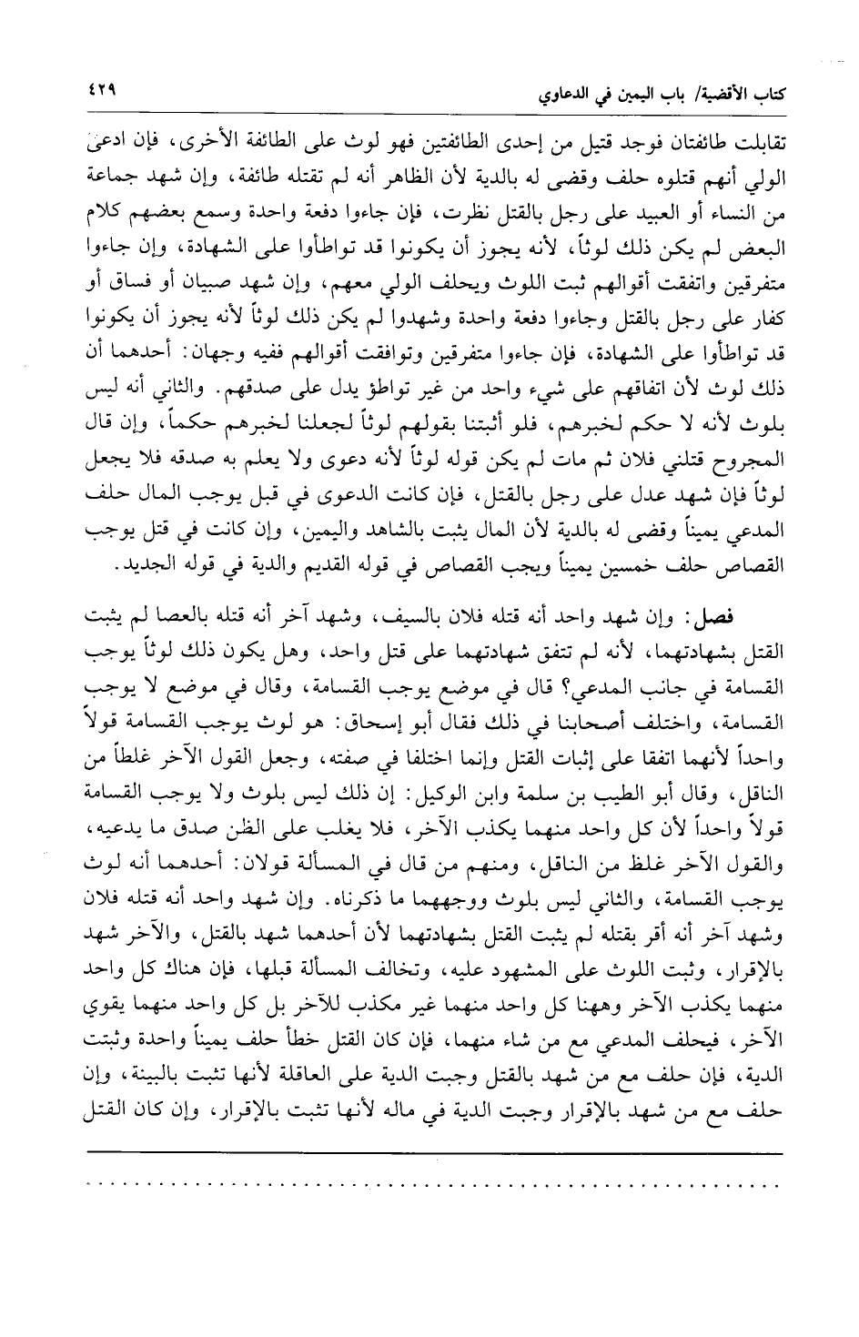 تقابلت طائفتان فوجد قتيل من إحدى الطائفتين فهو لوث على الطائفة الأخرى فإن ادعى الولي أنهم قتلوه حلف وقضى له بالدية لأن الظاهر أنه لم تقتله طائفة وإن شهد جماعة من النساء أو العبيد على رجل بالقتل نظرت فإن جاءوا دفعة واحدة وسمع بعضهم كلام البعض لم يكن ذلك لوثا لأنه يجوز أن يكونوا قد تواطئوا على الشهادة وإن جاءوا متفرقين واتفقت أقوالهم ثبت اللوث ويحلف الولي معهم وإن شهد صبيان أو فساق أو كفار على ترجل بالقتل وجاءوا دفعة واحدة وشهدوا لم يكن ذلك لوثاً لأنه جوز أن يكونوا قد تواطئوا على الشهادة فإن جاءوا متفرقين وتوافقت أقوالهم ففيه وجهان: أحدهما: أن ذلك لوث لأن اتفاقهم على شيء واحد من غير تواطؤ يدل على صدقهم والثاني: أنه ليس بلوث لأنه لا حكم لخبرهم فلو أثبتنا بقلوهم لوثاً لجعلنا لخبرهم حكماً وإن قال المجروح قتلني فلان ثم مات لم يكن قوله لوثاً لأنه دعوى ولا يعلم به صدقه فلا يجعل لوثاً فإن شهد عدل على رجل بالقتل فإن كانت الدعوى في قبل يوجب المال حلف المدعي يميناً وقضى له بالدية لأن المال يثبت بالشاهد واليمين وإن كانت في قتل يوجب القصاص حلف خمسين يميناً ويجب القصاص في قوله القديم والدية في قوله الجديد.