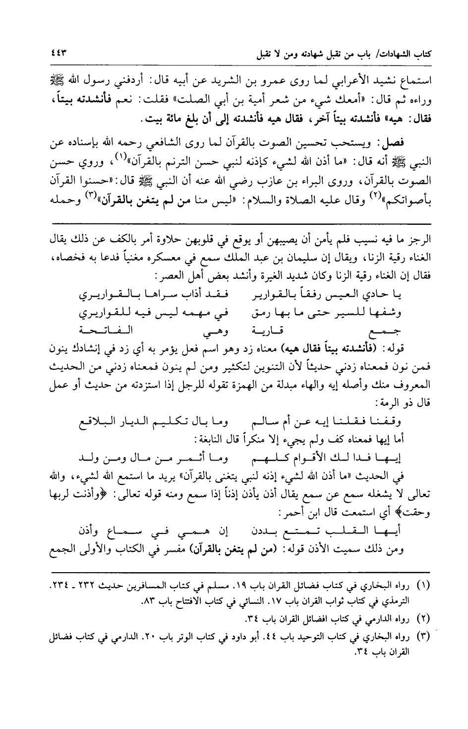 استماع نشيد الأعرابي لما روى عمرو بن الشريد عن أبيه قال: أردفني رسول الله صلى الله عليه وسلم وراءه ثم قال: "أمعك شيء من شعر أمية بن أبي الصلت" فقلت: نعم فأنشدته بيتاً فقال: "هيه". فأنشدته بيتاً آخر فقال هيه فأنشدته إلى أن بلغ مائة بيت.