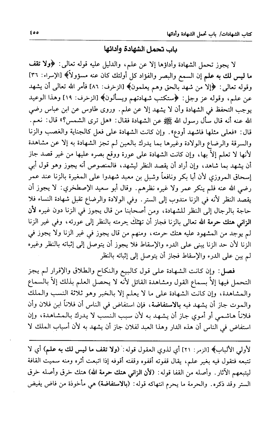 لا يجوز تحمل الشهادة وأداؤها إلا عن علم والدليل عليه قوله تعالى: {وَلا تَقْفُ مَا لَيْسَ لَكَ بِهِ عِلْمٌ إِنَّ السَّمْعَ وَالْبَصَرَ وَالْفُؤَادَ كُلُّ أُولَئِكَ كَانَ عَنْهُ مَسْؤُولاً} [الإسراء: 36] وقوله تعالى: {إِلَّا مَنْ شَهِدَ بِالْحَقِّ وَهُمْ يَعْلَمُونَ} [الزخرف: 86] فأمر الله تعالى أن يشهد عن علم وقوله عز وجل: {سَتُكْتَبُ شَهَادَتُهُمْ وَيُسْأَلونَ} [الزخرف: 19] وهذا الوعيد يوجب التحفظ في الشهادة وأن لا يشهد إلا عن علم وروى طاوس عن ابن عباس رضي الله عنه أنه قال سأل رسول الله صلى الله عليه وسلم عن الشهادة فقال: "هل ترى الشمس"؟ قال: نعم قال: "فعلى مثلها فاشهد أودع". وإن كانت الشهادة على فعل كالجناية والغصب والزنا والسرقة والرضاع والولادة وغيرها بما يدرك بالعين لم تجز الشهادة به إلا عن مشاهدة لأنها لا تعلم إلا بها وإن كانت الشهادة على عورة ووقع بصره عليها من غير قصد جاز أن يشهد بما شاهد وإن أراد أن يقصد النظر ليشهد فالمنصوص أنه يجوز وهو قول أبي إسحاق المروزي لأن أبا بكر ونافعاً وشبل بن معبد شهدوا على المغيرة بالزنا عند عمر رضي الله عنه فلم ينكر عمر ولا غيره نظرهم وقال أبو سعيد الإصطخري: لا يجوز أن يقصد النظر لأنه في الزنا مندوب إلى الستر وفي الولادة والرضاع تقبل شهادة النساء فلا حاجة بالرجال إلى النظر للشهادة ومن أصحابنا من قال يجوز في الزنا دون غيره لأن الزاني هتك حرمة الله تعالى بالزنا فجاز أن تهتك حركته بالنظر إلى عورته وفي غير الزنا لم يوجد من المشهود عليه هتك حركته ومنهم من قال يجوز في غير الزنا ولا يجوز في الزنا لأن حد الزنا يبنى على الدرء والإسقاط فلا يجوز أن يتوصل إلى إثباته بالنظر وغيره لم يبن على الدرء والإسقاط فجاز أن يتوصل إلى إثباته بالنظر.